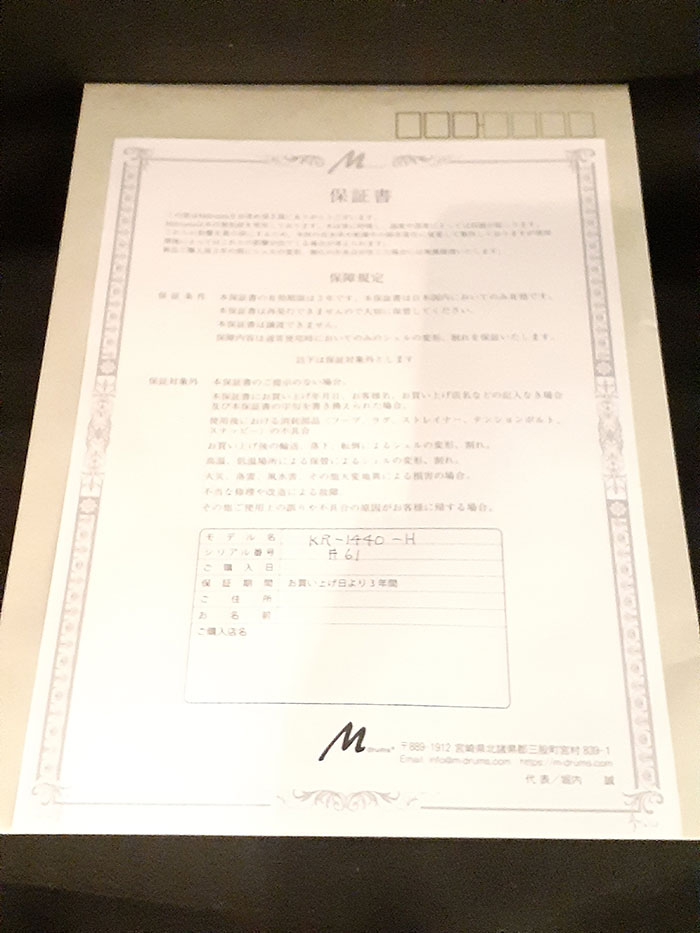 木材は生きています。常に呼吸し、温度や湿度によっては収縮が起こります。M drumsはこれらの影響を最小限にするため、木材の含水率や乾燥中の経年変化に留意して製作しておりますが、使用環境によってはこれらの影響が出てくる場合が考えられます。新品ご購入後3年の間にそれらの不具合が生じた場合には無償での修理をさせていただきます。