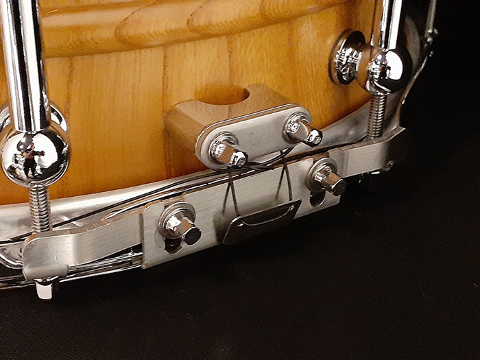 Snappy Just Fit Barで高さ調整する事により、オーケストラ用のスネアの全面当たりのストレートワイヤースナッピーとスネアボトムヘッド面の密着を可能とします。
