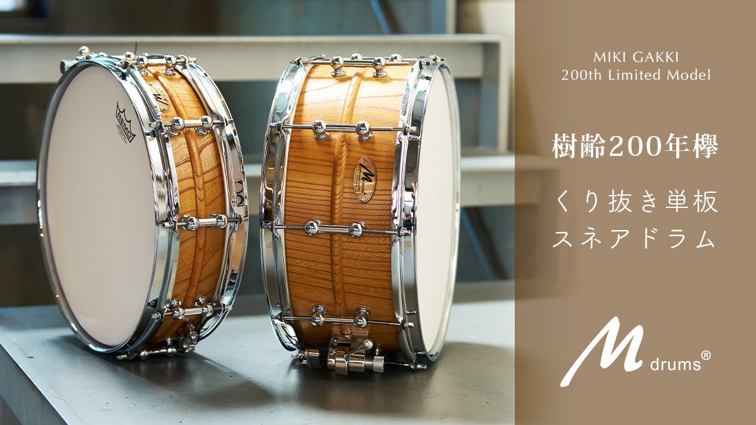 MIKI GAKKI創業200周年を記念して、Mdrums社に『樹齢200年の木材』(画像参照)を探していただき特別に14"x4",14"x5",14"x6,5"の3サイズ、各サイズ1台ずつ製作して頂いたスペシャルな個体です。