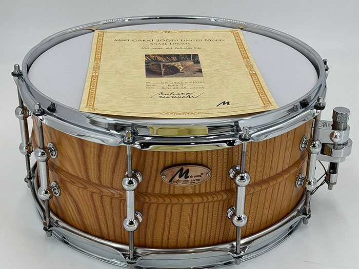 MIKI GAKKI創業200周年を記念して、Mdrums社に『樹齢200年の木材』(画像参照)を探していただき特別に14"x4",14"x5",14"x6,5"の3サイズ、各サイズ1台ずつ製作して頂いたスペシャルな個体です。