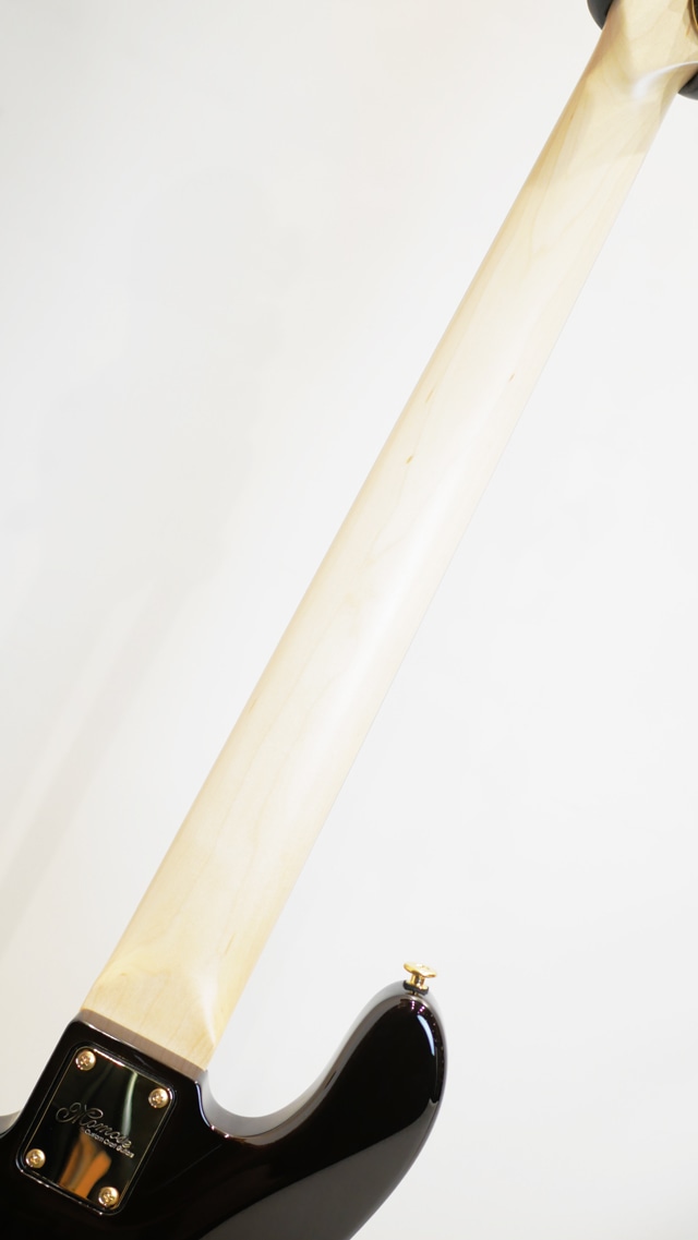 アルダー材ボディのトップに桜材用いられたラミネートボディ、メイプルネック&エボニー指板のウッドコンビネーションになります。黒を基調としたカラーリング”Tenshu Black Vertical Gradation”、楽都松本のイメージした指板インレイ、ゴールドカラーを基調とした各部パーツ、特注品のアクリル素材を用いて冬の雪をレジンで表現したピックガードがコンセプトを引き立てます。