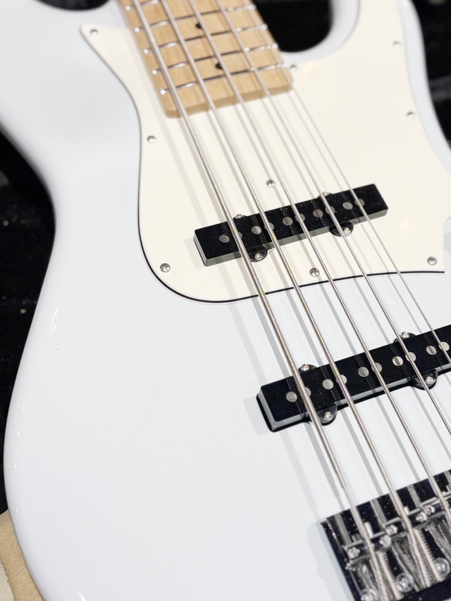 本機は、アルダー材ボディ、メイプル材ネック、メイプル材指板、フレットはエターナルフレット(オリジナルステンレスフレット)「EI-W-016WARM」を装備、「Anthra」レギュラースペックを基本にオーダーしたスタンダードスタイルに、オリジナルカラー”The Machineries”から「Planet White(PNW)」をチョイスしやや青みがかったホワイトと、3Plyパーチメントピックガードの組み合わせでクラシックなルックスに仕上げていただきました。アルダー&メイプルのコンビネーションによる落ち着いた色気のある中低域が弾むようにアウトプットされ、重心が低くも立ち上がり良いトーンがピッキングから感じられます。歯切れの良いステンレスフレットによるレスポンスの高さを保ちつつも粘りのある音の芯があり、抑えめなピッキングでも音像と存在感のあるトーンを生み出し、力強いピッキングアプローチにもリミットを感じない受け応えをしてくれる頼もしい仕上がりです。テンポ良くグイグイ引っ張るようなプレイでもアグレッシブに演奏が出来る1本です。