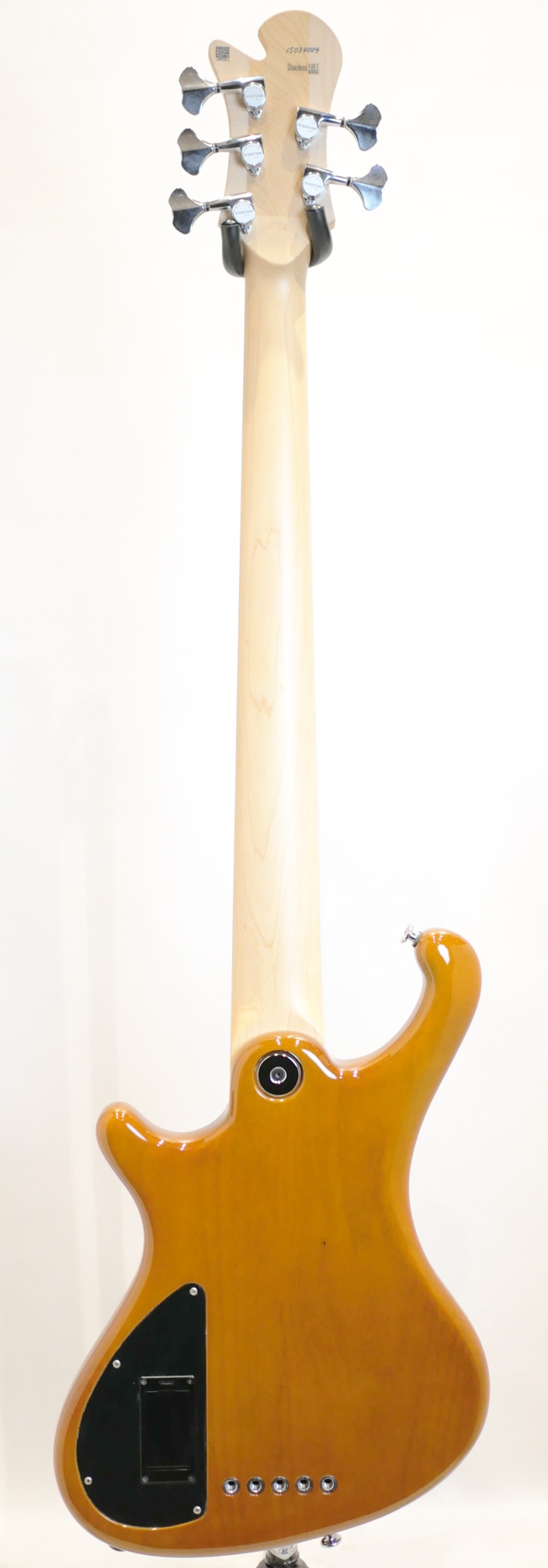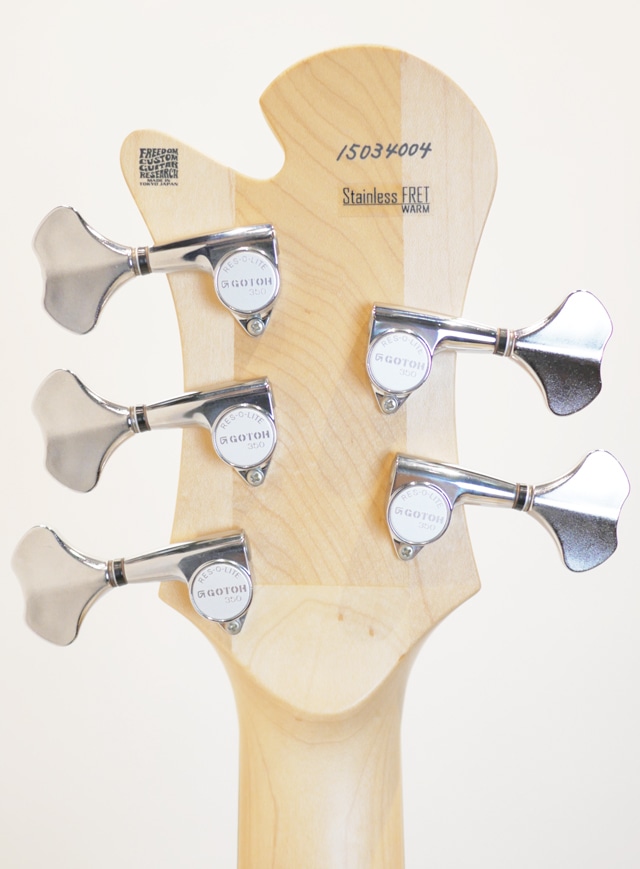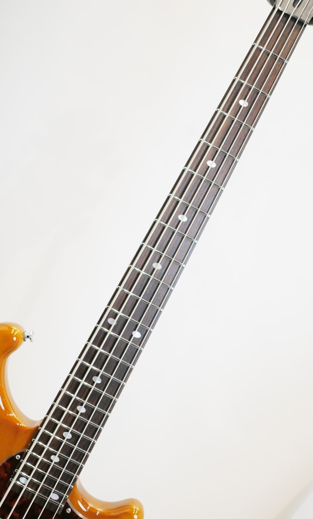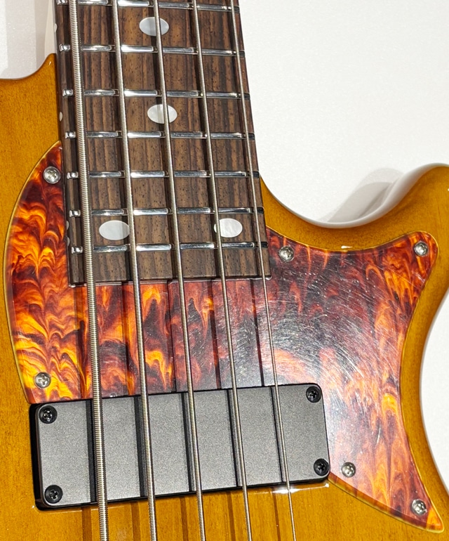 基本仕様に、アルダーボディ、ローズウッド指板、アクリルベッコウピックガード、オリジナルステンレスフレット「09/Warm」、クロームパーツ、オリジナルカラー”響 - Hibiki -”から「ムシノネ(MSN)」がセレクトされております。トラッドなウッドスペックはそのコンセプトに違わぬ、ニュアンスに対して忠実かつ繊細なレスポンス、ワイドレンジで音抜けが良く、アクティヴ回路を搭載したコンパクトボディのベースとは思えないほど豊かなパッシヴサウンドもクリエイトしております。JBやPBのトーンとは異なったハムバッカーピックアップの上質に引き締まった音の芯と心地よい低音域、楽器全体の一体感ある鳴りが弦を弾く度に感じて頂けることでしょう。アクティブ(フラット設定)からパッシブに切り替えた際の音質の差が感じられないのも注目ポイントです。操作性に安定感、馴染み深いのに新しさを感じるサウンド、オールラウンダーと位置付けられたのにも納得の仕上がりを持っております。