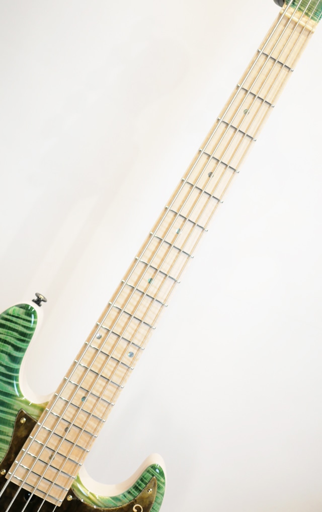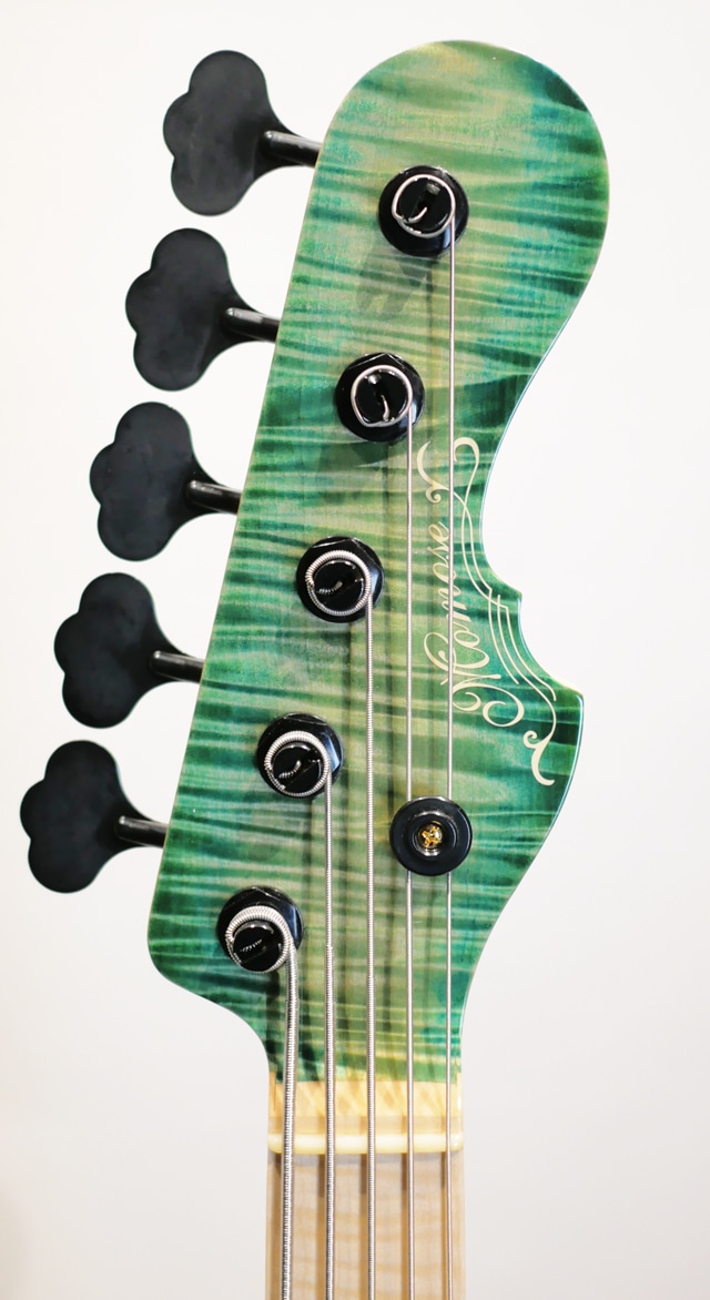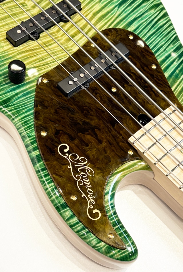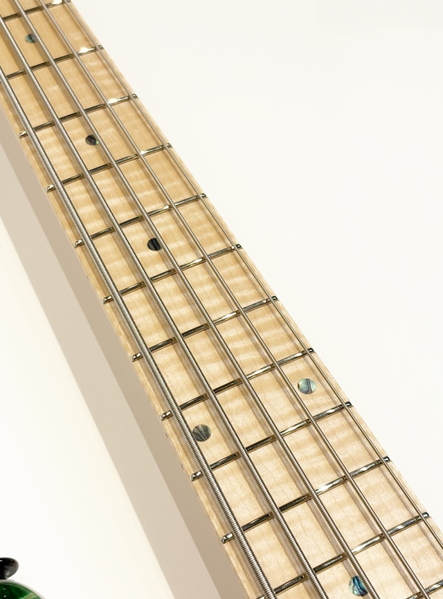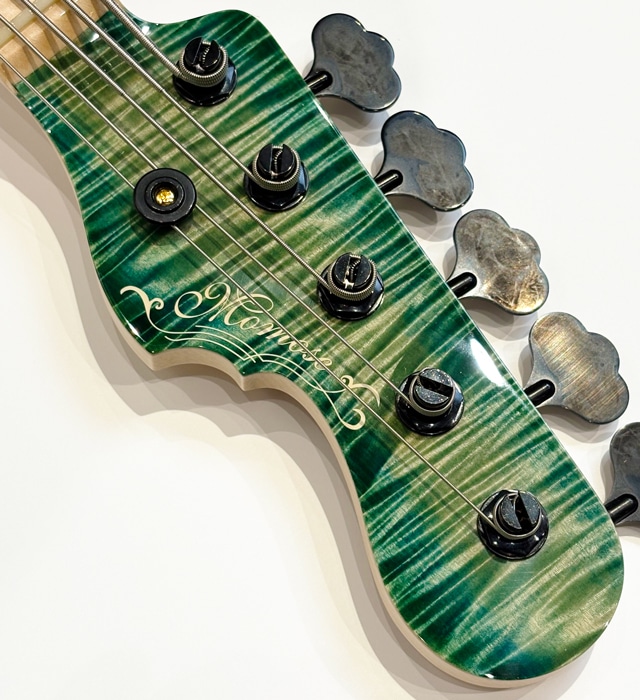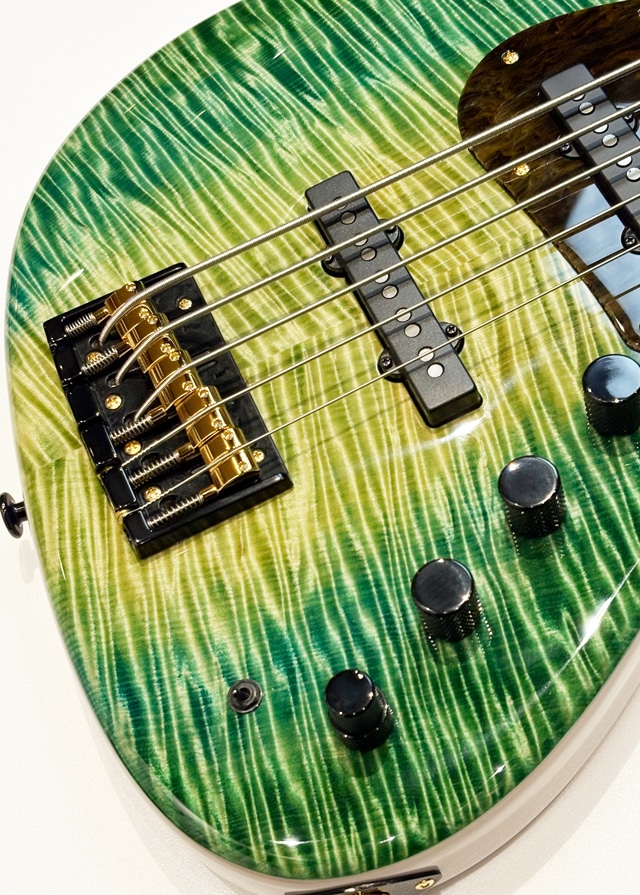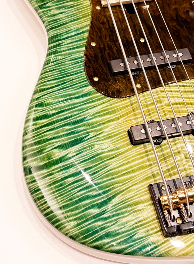 トチ&アルダーによるラミネートボディのローミッドに引き締まったトーンに、メイプルネックと指板のコンビネーションによりしなやかで上品に膨らむローミッドが生み出されており、馴染み深いトーンにも繊細で密度のある太く芳醇なベースサウンドが感じられます。また、当機にはアクティブサーキットが導入されており、Aguilar/OBP-2が嫌味の無い可変を実現してくれており、楽器の持つキャラクターを素直に彩ってくれます。杢の濃淡によるグリーンカラーのグラデーションとボディバックのシースルーホワイトの対比も見所、温かみのある上質なベースサウンドが楽しめる1本と思います。