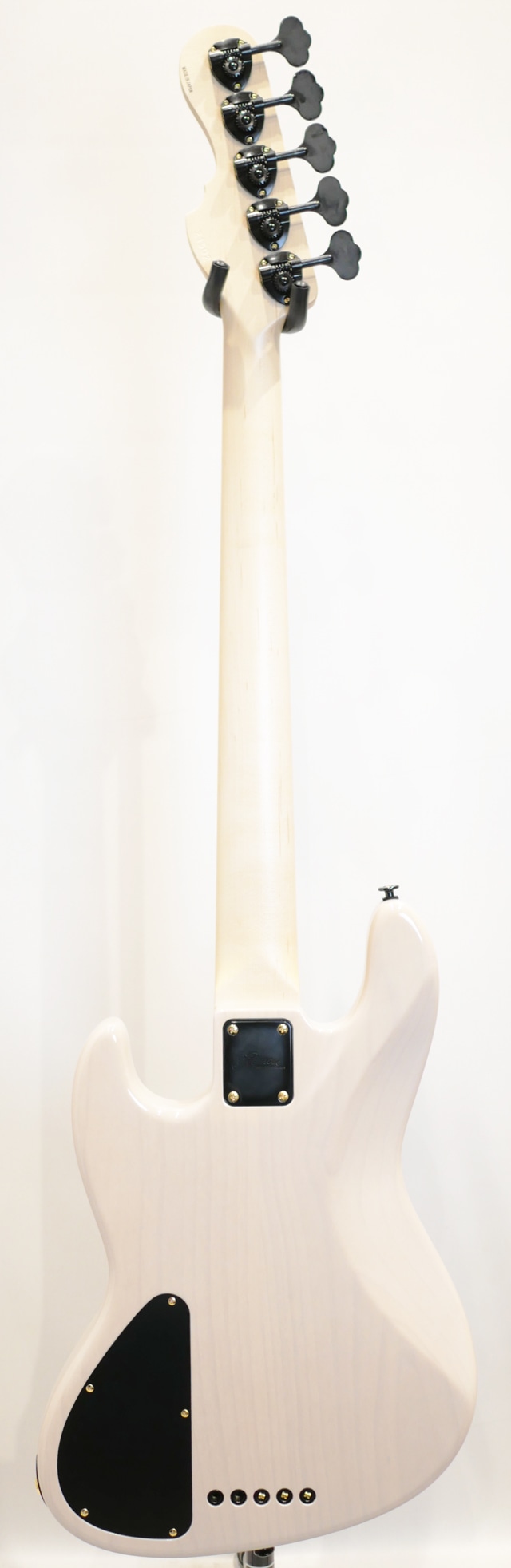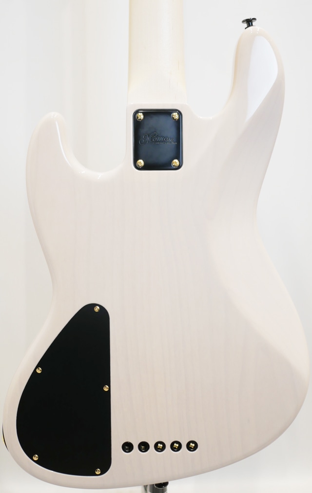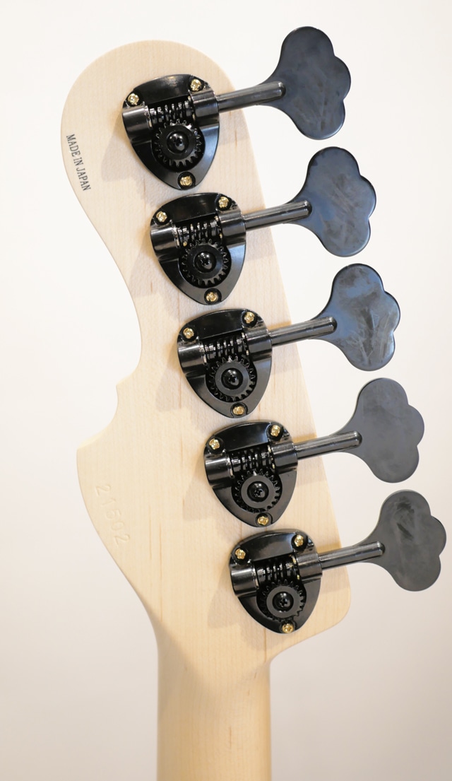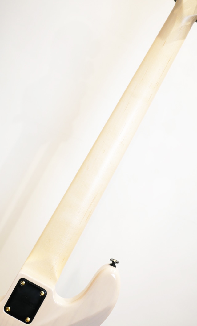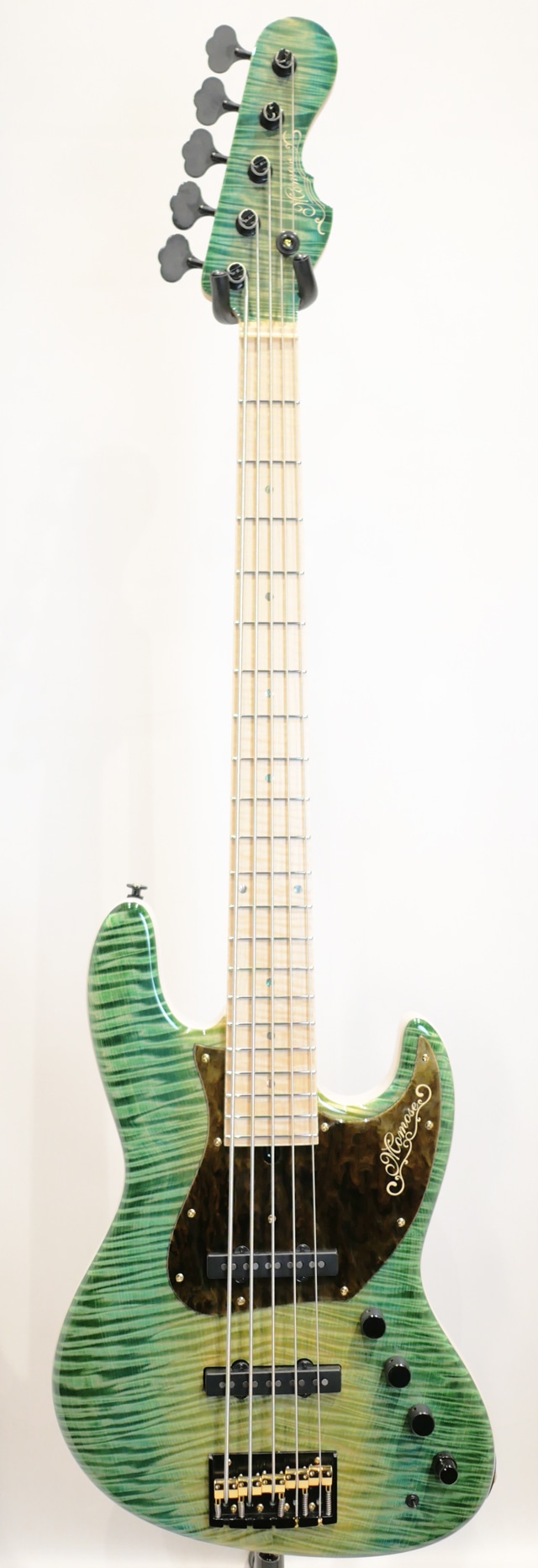 トチ&アルダーによるラミネートボディのローミッドに引き締まったトーンに、メイプルネックと指板のコンビネーションによりしなやかで上品に膨らむローミッドが生み出されており、馴染み深いトーンにも繊細で密度のある太く芳醇なベースサウンドが感じられます。また、当機にはアクティブサーキットが導入されており、Aguilar/OBP-2が嫌味の無い可変を実現してくれており、楽器の持つキャラクターを素直に彩ってくれます。杢の濃淡によるグリーンカラーのグラデーションとボディバックのシースルーホワイトの対比も見所、温かみのある上質なベースサウンドが楽しめる1本と思います。