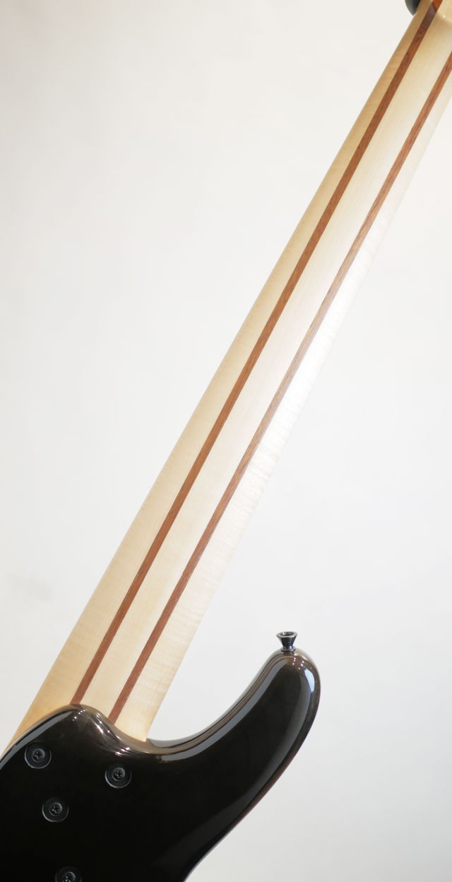 ソリッドアッシュボディ、ボルトオン構造の5pcネックはハードメイプルを主として設計しております。数年前はSugiの代名詞とも言えるアクアティンバーが使用されてましたが、コロナ禍の影響により入手困難となりハードロックメイプルへとシフト致しました。サウンドへの影響は言うまでも無く、ミドルの存在感がグッと際立った印象を受けます。今回のネック材変更は個人的には良い方向へ向いた印象を受けます。