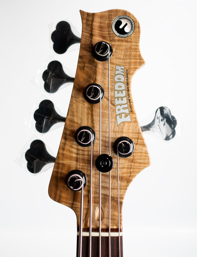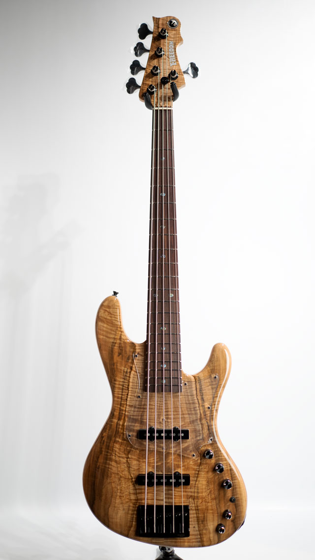 この度入荷致しましたRhinoはフリーダム流のJBモデルとお考え下さいませ。ボディトップにはユニークなアンブロシアメイプルをセレクト。ボディバックはアルダーをチョイス。アリミゾジョイント構造を採用したメイプルネック/ローズ指板。アリミゾジョイントはセットネック構造並みの剛性の高さを持ち、ネジ一本で締め具合を調整する事で、倍音感をコントロールするシステムになります。ピックアップは工房にてハンドワウンドで巻かれたフリーダムオリジナルピックアップを搭載。総重量約4.59kgと5弦モデルとしては標準的なウェイトをキープ。