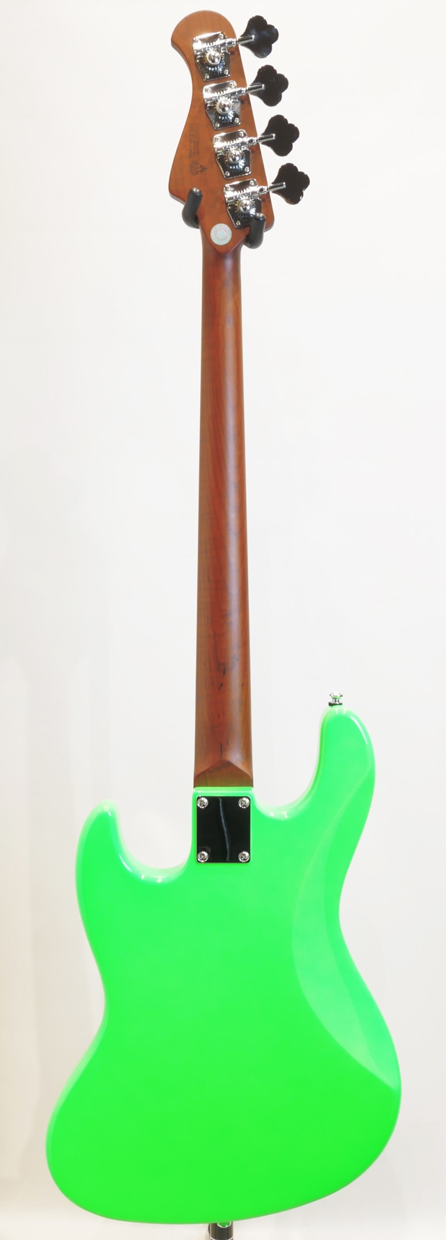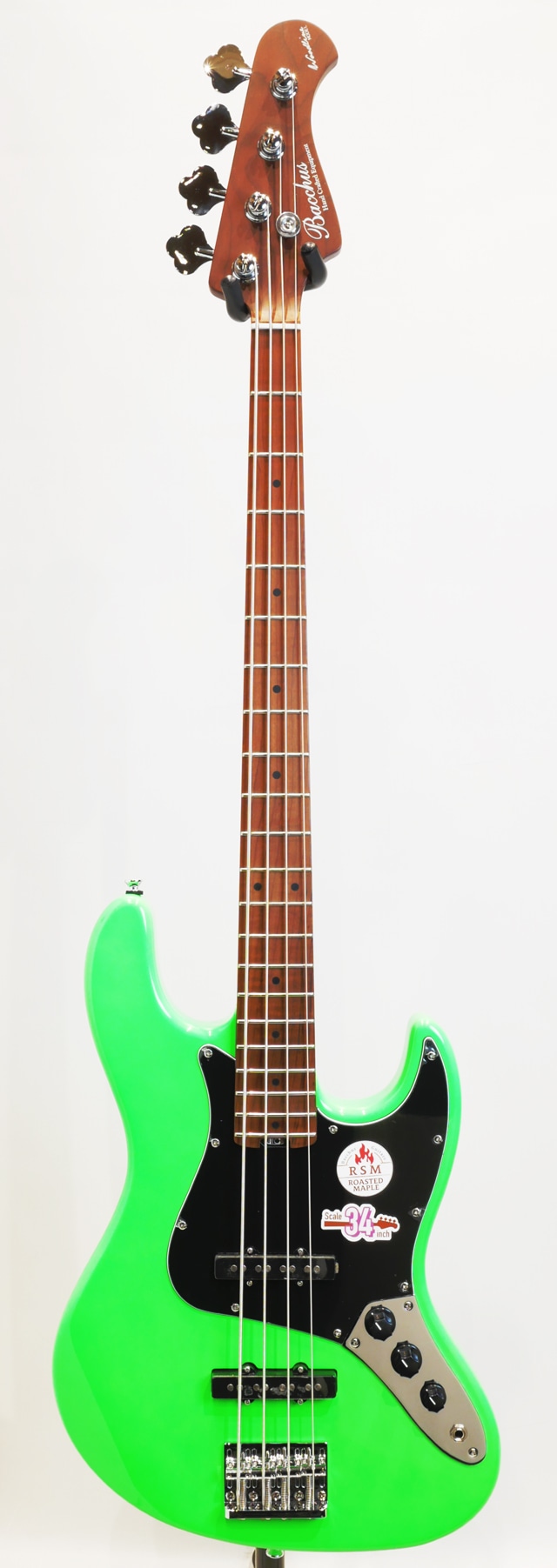 Bacchus Global Series Handmadeシリーズの仕様を海外工場にて生産する事でハイコストパフォーマンスを実現しているBacchusの定番ライン。そのお求めやすい価格帯と確かなクオリティで人気の高いシリーズです。 本国、飛鳥ファクトリーにて製作される最上位機種”WOODLINE”を基に海外生産されている”WL4-STD”モデル。 当機最大の特徴は一目見て分かる色濃いネック材。そのネック&指板には、高温で加熱処理して材の中の水分や油分を一定数量に揮発させることにより剛性を高め、豊かな生鳴りと経年変化したビンテージのような小慣れたトーンを生み出す、高級機種で採用される事の多いローステッドメイプル材が使用されております。ボディは一般的なJBモデルよりも少しスマートなサイズとなるディンキーシェイプが採用されており取り回しの良いサイズが実現しております。 また、上位機種”WOODLINE”シリーズ定番”ターボスイッチ”も搭載され、トーンノブをプルアップすると2つのシングルピックアップをシリーズ(直列)接続し、従来とは一味違う太く力強いハムバッキング・ピックアップのようなサウンドを作り出します。 小振りなベースながらもネック材の特徴もあり力強い低音を持ち幅広いシチュエーションに対応可能なポテンシャルを持っておりますので、これからベースを始めようと思っていた方や、取り回しが良くて使いやすい2本目をお探しだった方におススメのベースです。 ※掲載画像はサンプルです。 ※外観部の仕上げ不良、金属パーツの傷やくすみは保証対象外になります。 Body : Nyatoh Neck : Roasted Maple Fingerboard : Roasted Maple Nut : Graphtech TUSQ XL Bridge : JB bridge w/ brass saddle Machineheads : Open Gear Type Pickup : Original JB set Control : 2Vol,1Tone(Pull up=Turbo SW) Scale : 864mm(34inch) Fingerboard Radius : 310R Width at Nut : 38.0mm Case:オリジナルソフトケース