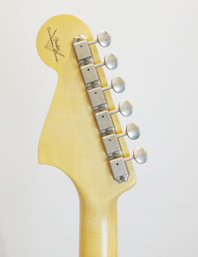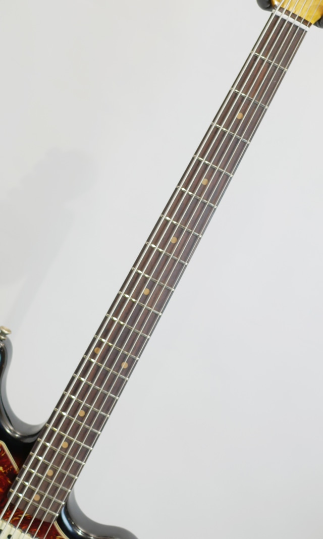 アルダーボディ、メイプルネック/ローズ指板(スラブ貼り)。ポジションマークはクレイドットになります。スイッチコントロールは4つのタイプになりますので、63年頃のスペックを基に設計された個体になります。ギターよりも1オクターブ低いチューニングが基本チューニングになるベースVI、バリトンギターと言う表現が正しい様にも思います。ギターやベースと比べて、ベースVIの洗堀者が少ない事は確かです。それ故、使い方が分からないと言う声を耳にする機会も多いですが、かえって正しい使い方等は無く、何をやっても正解であるのがBASSVI最大の魅力だと考えております。用途は無限大にございます。是非、洗堀者になって頂ければと思います。