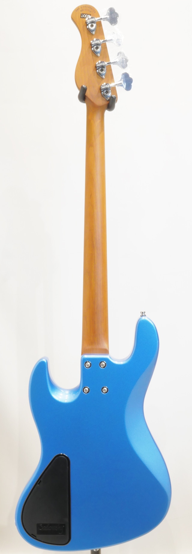 ネックのローステッドメイプル材は”Sadowsky”上位機種では追加オプションとして用いられている、高温での加熱処理を施し木材の中の水分や油分を揮発させることにより剛性を高めたメイプル材となり、反りへの安定性と素早い立ち上がり(スムーズなレスポンス)、音抜けの良い響きと芯の太さが特徴として挙げらる木材です。
