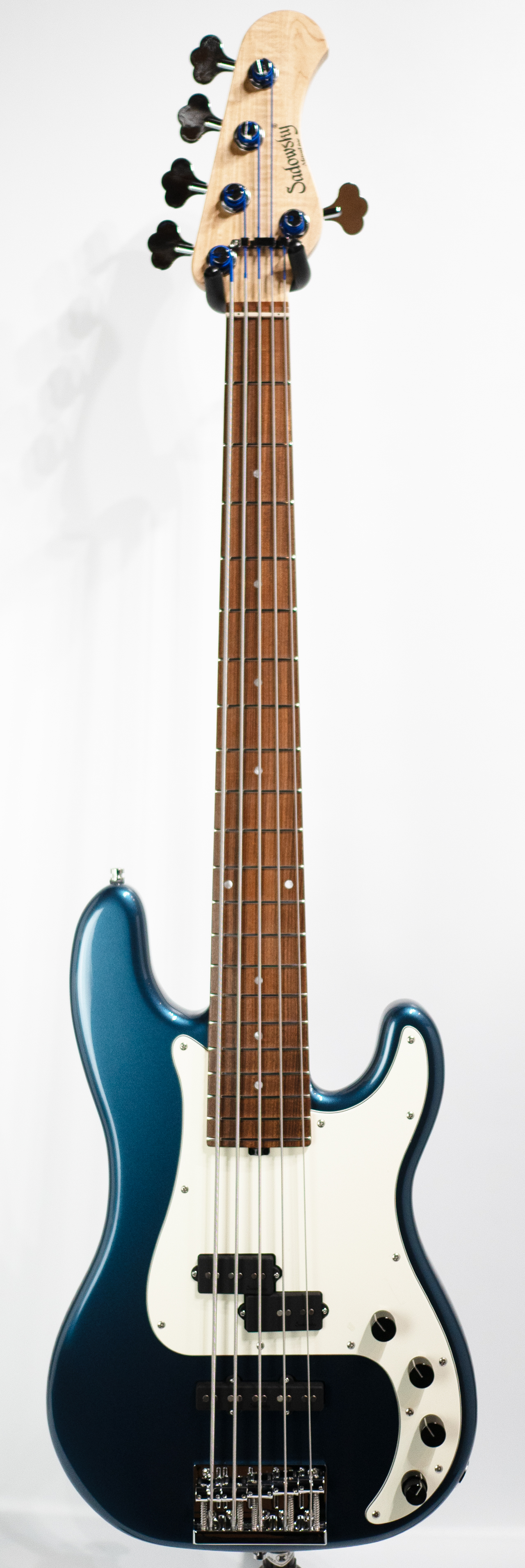 本機は、アルダーボディ、メイプルネック、モラド(パーフェロー)指板、レギュラーサイズのPBシェイプ(Classic P)にてオリジナルP/Jピックアップを配した“Sadowsky”のPJ5弦モデルです。PBシェイプの4弦P/Jモデル、JBシェイプの5弦P/Jモデルは比較的目にする機会が多い事と思いますが、PBシェイプでの5弦モデルはNYCモデルを除いては珍しく、現"Metroline”シリーズの豊富なバリエーションの中でも注目度が高まっているモデルの1つです。