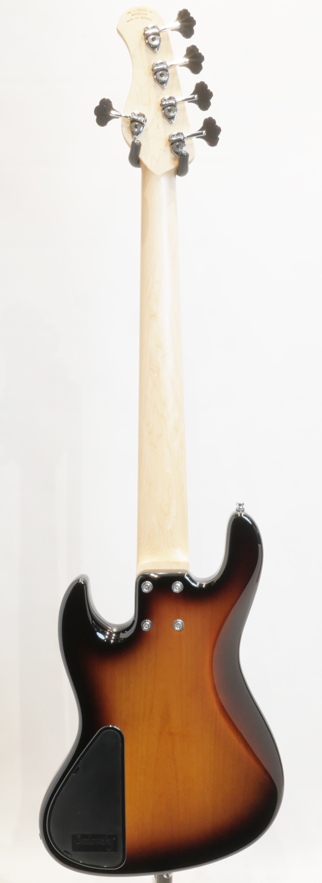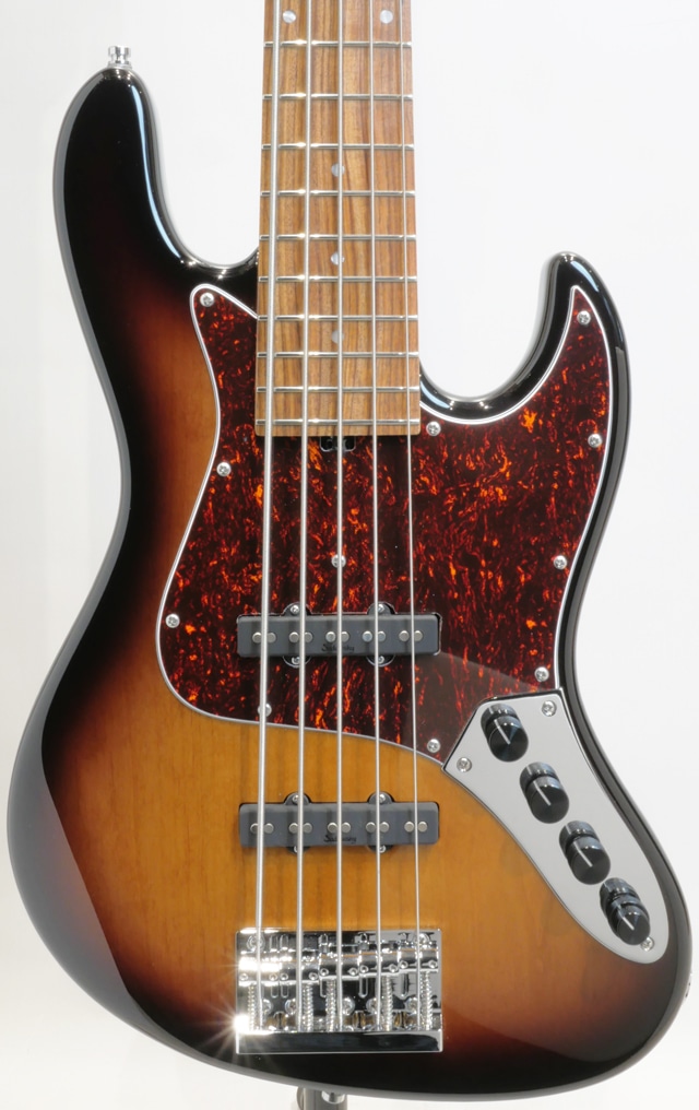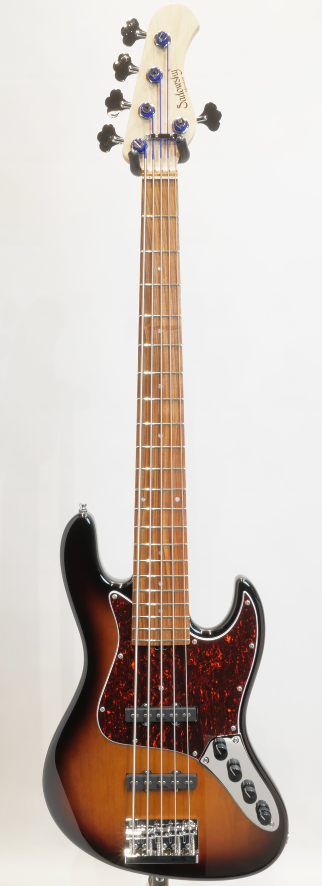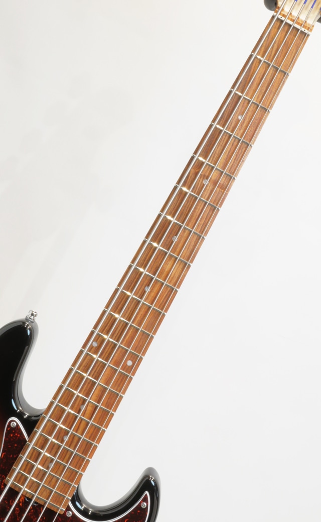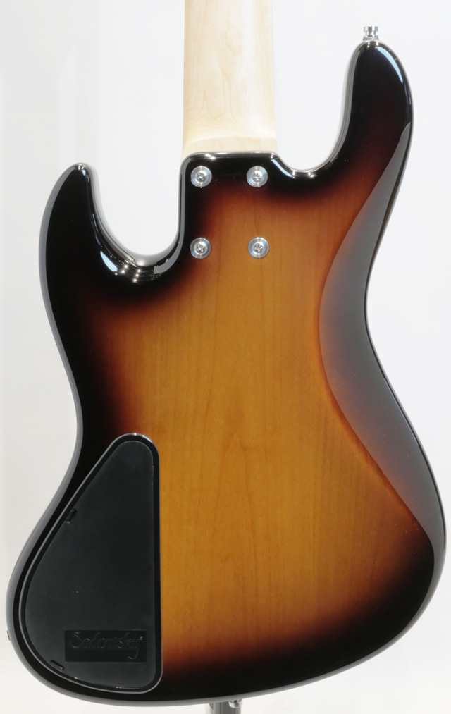 本機は、中空構造のチェンバード加工が施されたアルダーボディ、メイプルネック&モラド指板、トラディショナルなJBモデルよりも若干小振りなディンキーシェイプ(Sleek Undersized J)と言われるボディサイズとピックガードとコントロールパネルを装着した“Sadowsky”のスタンダードビンテージスタイル”VJ5”モデルです。