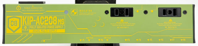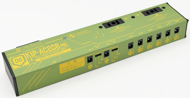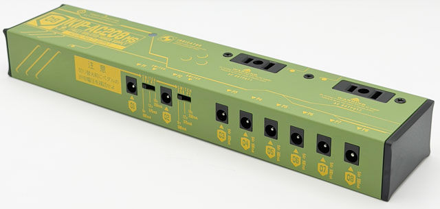 マルチエフェクターなどの専用アダプターを使用する機材を搭載したボードに便利なACコンセント出力×2系統を備えたマルチパワーサプライです。DC出力は2系統の切り替え(9V500mA,12V375mA,18V250mA)可能端子を含めた8portを装備し、グラウンドまで完全に個別にしたフルアイソレート回路を採用。Port3-8 は無負荷時供給電圧を約9.8V (最適環境下において) に、高負荷時でも9.4V を確保出来るよう設定。特にDistortionやOverdrive系のペダルで音に張りと厚みが生まれ、ブライトネスも上がる効果も期待できます。可能な限りコンパクトに設計(W240×D54×H30mm)し、ボード内のスペース確保を目指しました。筐体自体を放熱板として使用する機構を採用しDC出力最大消費電力18W (※Wのおよその計算法としてV×Aとする)の容量を確保。マルチエフェクターなどを含む大型のメインボードで活躍するモデルです。