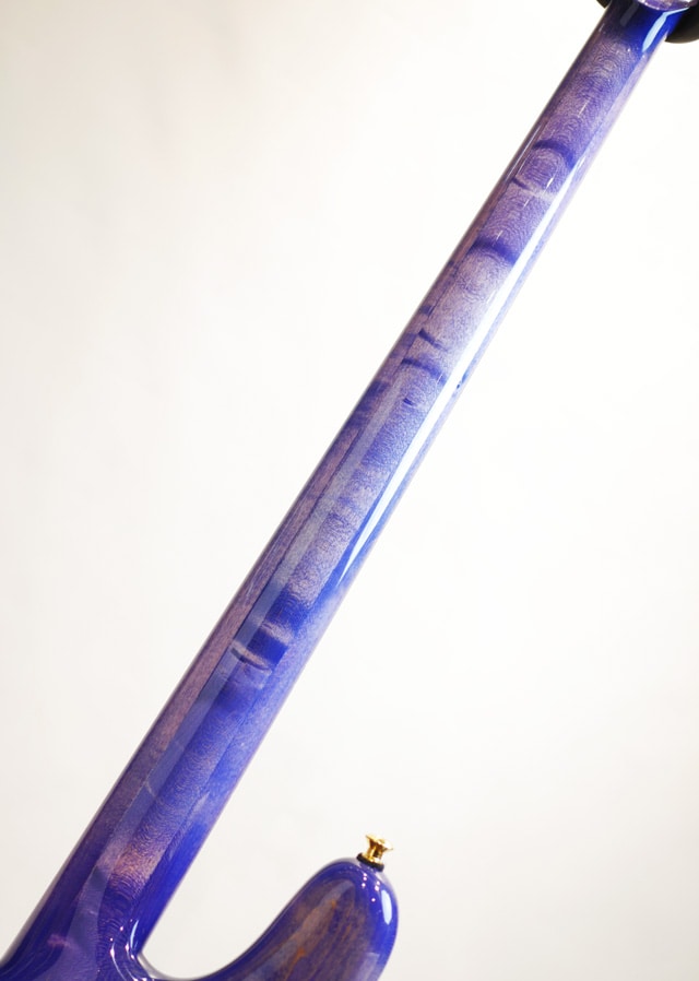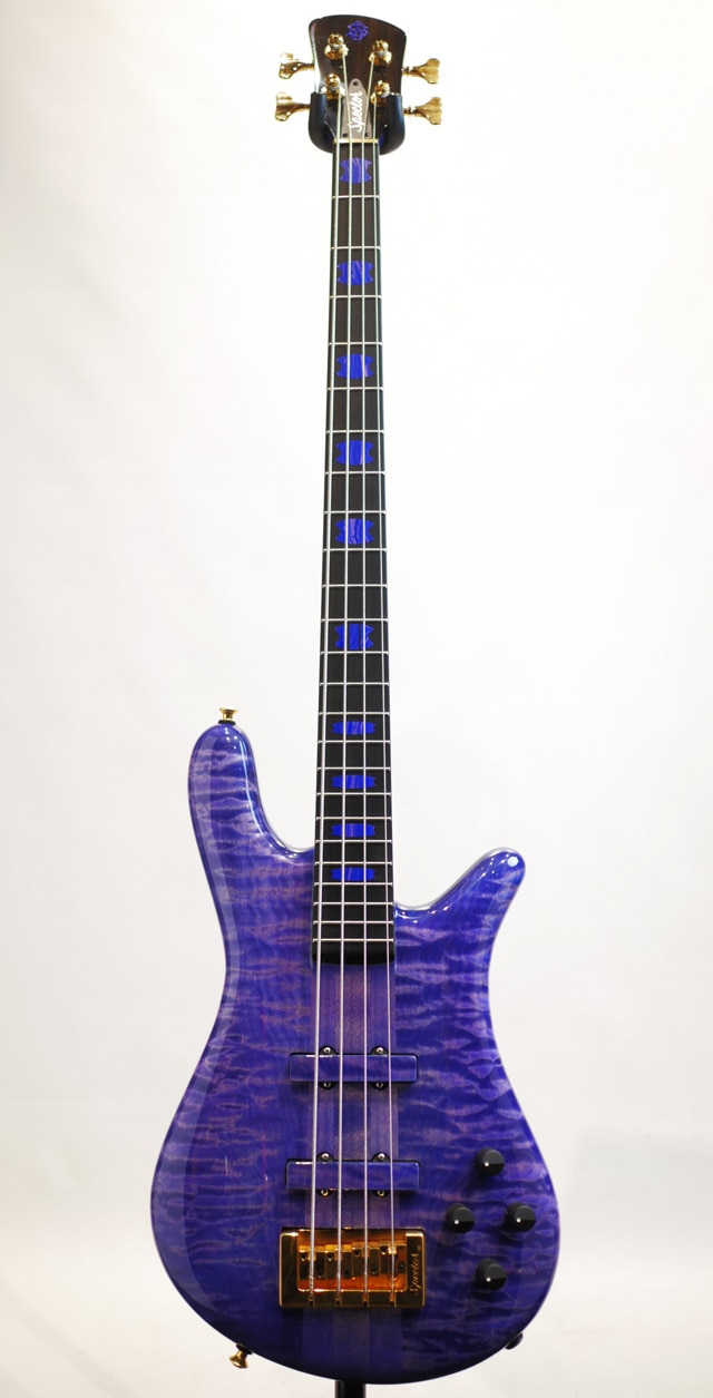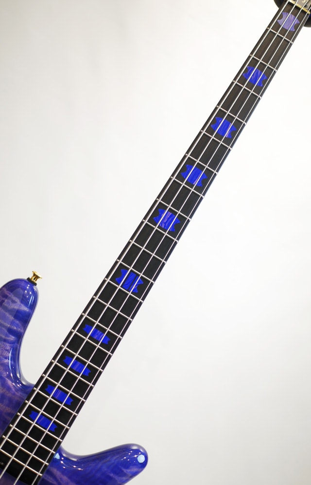キルトメイプルトップ、プレーンメイプルバックのラミネイトウィングボディ。スルー構造のメイプル3pcネック/エボニー指板。EMGピックアップをJJレイアウトにてマウント。ピックアップのフロント面に木材を貼り塗装が施されております。またネックグリップはナローワイド、Thinネックシェイプにてオーダー、ジャズベース同等の細身のグリップで握り込みやすくプレイアビリティも向上。プリアンプはSpector HAZを搭載、18V駆動、9V駆動から選択可能ですが9Vをチョイス致しております。最近のSpector HAZプリアンプはディップスイッチが搭載され、4つのスイッチを組み合わせる事で2band-EQのフリーケンシーを切り替える事が可能。デフォルトはPRE KRAMER期のフリーケンシーに合わせております。