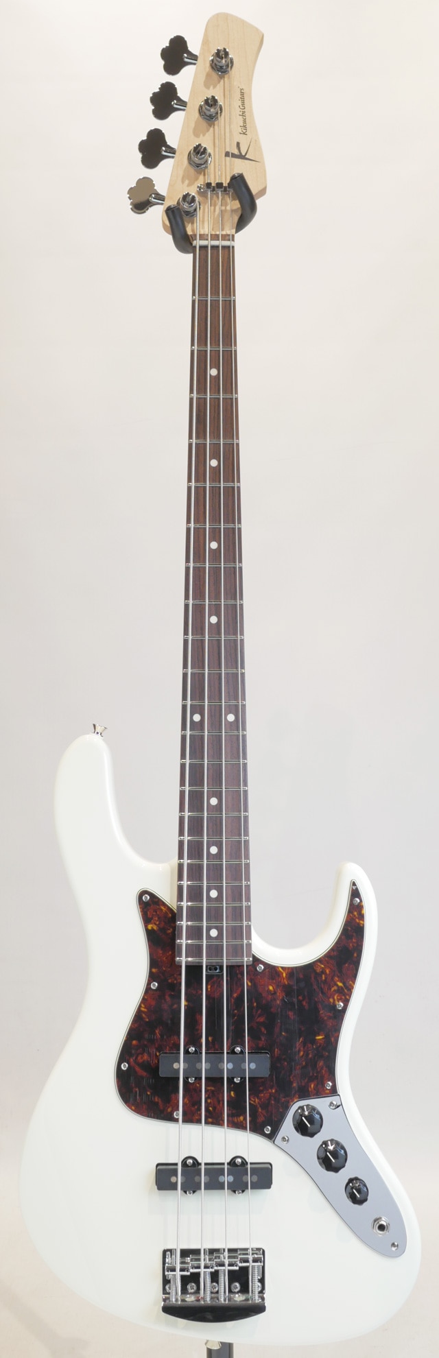 Kikuchi Guitars Hermes RV4 Passiveのlの入荷です。 過去に日本国内で生産されていたSadowsky Metroline。その他にもTYO、JTシリーズなど、現在でも高い評価を受けている日本製Sadowskyの総責任者が菊地嘉幸氏です。菊地氏は1990年にATELIER Zの立ち上げに関わったのち、93年に同ブランドを後任に託し単身渡米、Sadowsky NYCにてRoger Sadowskyより直接技術を学びました。渡米中にはJohn Suhrからフレットワークに関しての教示も受けており、多種多様なセットアップに対応する技術を身に着けます。帰国後、日本製Sadowskyの総監修を行い、Sadowskyが米国外の活動拠点をドイツに移すまでの20数年間、製作を続けてきました。Kikuchi Guitarsは、それらのギターやベースを製作するのに蓄積した、菊地氏の全ての知識やノウハウを活かした楽器作りを行うために立ち上げられたブランドです。 この度入荷致しました個体は菊池氏も納得した渾身のパッシブ4弦モデルになります。アルダーボディ、メイプルネック/ローズウッド指板。ピックアップはPassive モデル専用として新開発されたオリジナルピックアップを搭載。 アクティブシリーズのエルメスを単純にパッシブにしただけではなく非常に優れたサウンドとポテンシャルを持った楽器に仕上がっており、パッシブ楽器固有の木材が持つウォームなトーンを活かしたナチュラルなパッシブサウンドは、アクティブサーキットの必要性を感じさせない見事なバランス感を持ち合わせております。ボトムレンジに厚みと十分な太さがありながらも抜けの良さを兼ね添えております。ウッドマテリアルはアルダーボディとローズウッド指版王道のウッドスペックとなっており、バランスに優れた温かく包み込むようなトーンに加え、聴きなじみの良い低音をアウトプットしてくれます。 汎用性に優れた扱いやすい4弦JBをお探しだった方にオススメの商品となっております! Model:4st Body:Alder 2-Piece Neck:Maple Fingerboard:Rosewood Fingerboard Radius:12″ (305R) Nut Width:37mm Fret:DHP24H, 22F Scale:864mm (34″) Body Finish:Poly Hardware Color:Chrome Bridge:Hipshot 20mm Spacing Tuner:Hipshot License Ultra-Light Pickups:Original Custom J (4st)