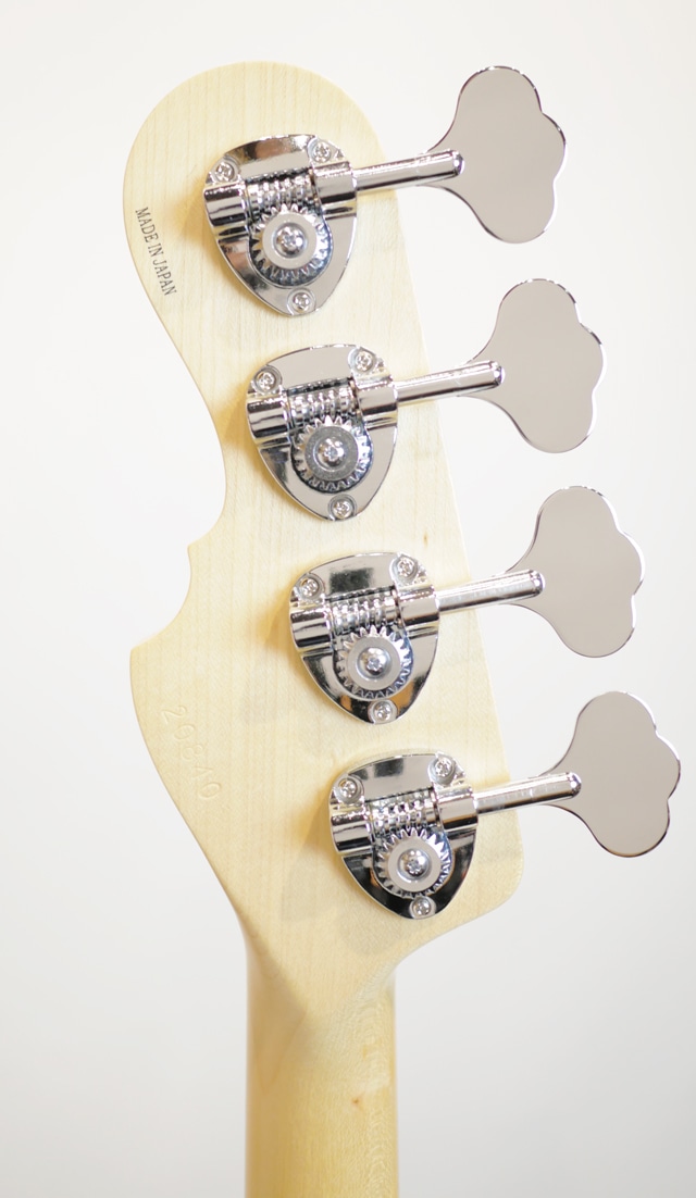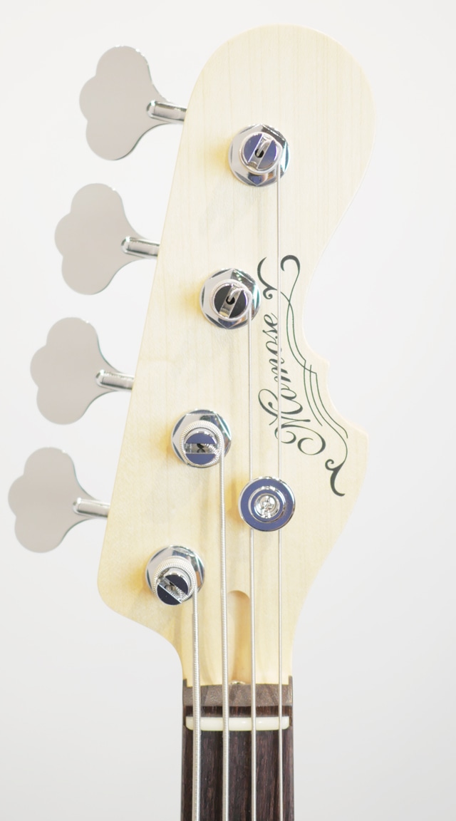 Momose Original Series『MJ』は、トラディショナルなJBスタイルを継承しつつも、Momose独自のブラッシュアップが施されたオリジナルモデルです。一般的なJBタイプと比べ、高音弦側のホーン部の抉りが大きく取られていることによりハイポジションの演奏性が高まるほか、手が大きなプレイヤーの方でもストレス無くハイフレットに向かって駆け上がるプレイが可能になります。また、オーソドックスなプレートジョイントを採用しながらもプレート部分に落とし込み加工を施すことで演奏性をさらに高め、指板サイドには指板と同材を使用したウッドバインディングを採用し滑らかな指板サイドを実現するほか、季節変化や長年の使用でフレットのバリが出てしまう様なトラブルも防止する様、演奏面でビハインドに成り得る箇所に細やかな処置が施されております。
