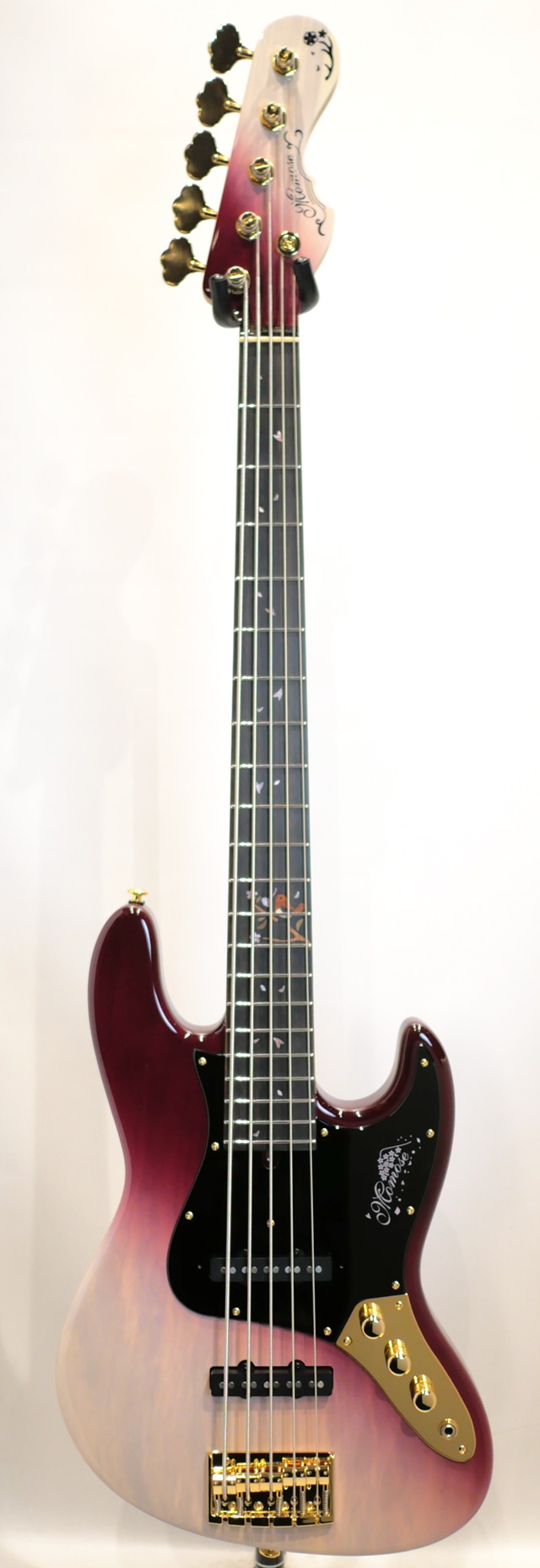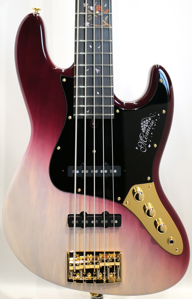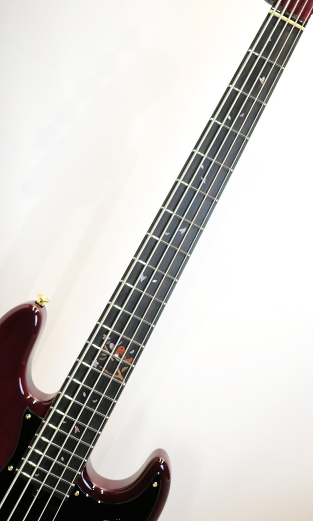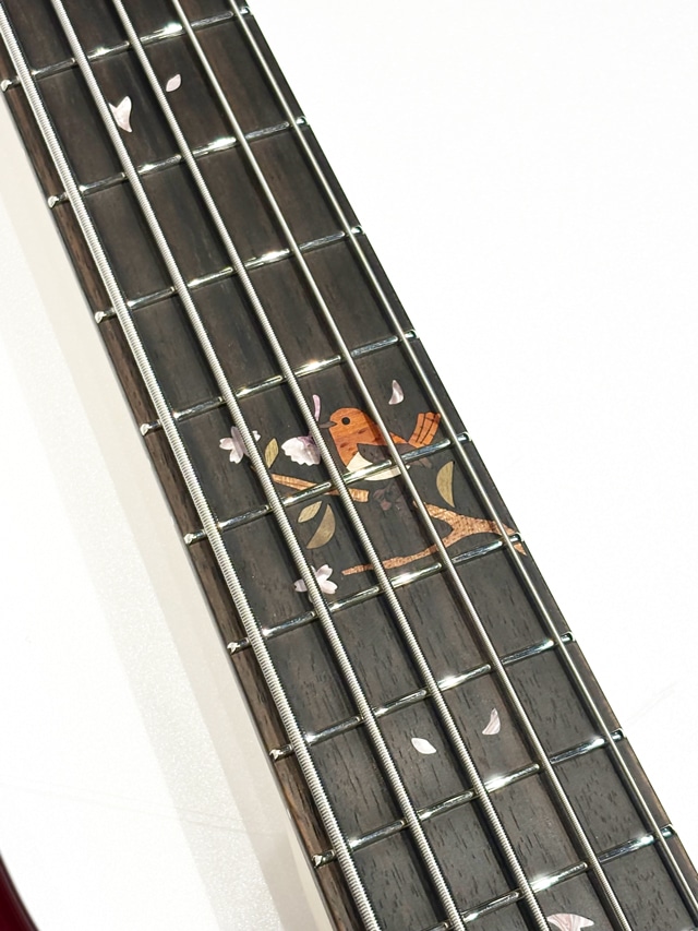 当機は、栃材と並び限定モデルで多く展開されております桜材、その土地その土地で入手された桜材のバックグラウンドを投影したデザインやモチーフをコンセプトデザインに反映した製品の人気が高く、今回は桜の名所としても名高い「吉野千本桜」を使用した出展数8本のリミテッドモデル5弦でございます。大胆な角度で塗装された「開花時の千本桜をイメージした、深みのある赤」で仕上げられており、まるで陶磁器、漆器といった伝統工芸品の中に並んでいるような木工品としての存在感が目の当たりにして強く感じられます。