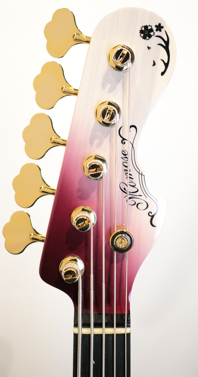 吉野山には約3万本もの桜が咲き誇ると言われています。谷から尾根にかけて広がるその様子をピックガードロゴと共に表現しました。指板にも巧みなインレイワークにより、舞い落ちる桜を色彩豊かに表現。桜の枝には奈良県の県鳥であるコマドリがデザインされています。ヘッドはボディと同じマッチングカラーで仕上げられ、吉野山の八重桜と奈良県のシンボルでもあるシカの角をイメージした特別ロゴが入れられています。