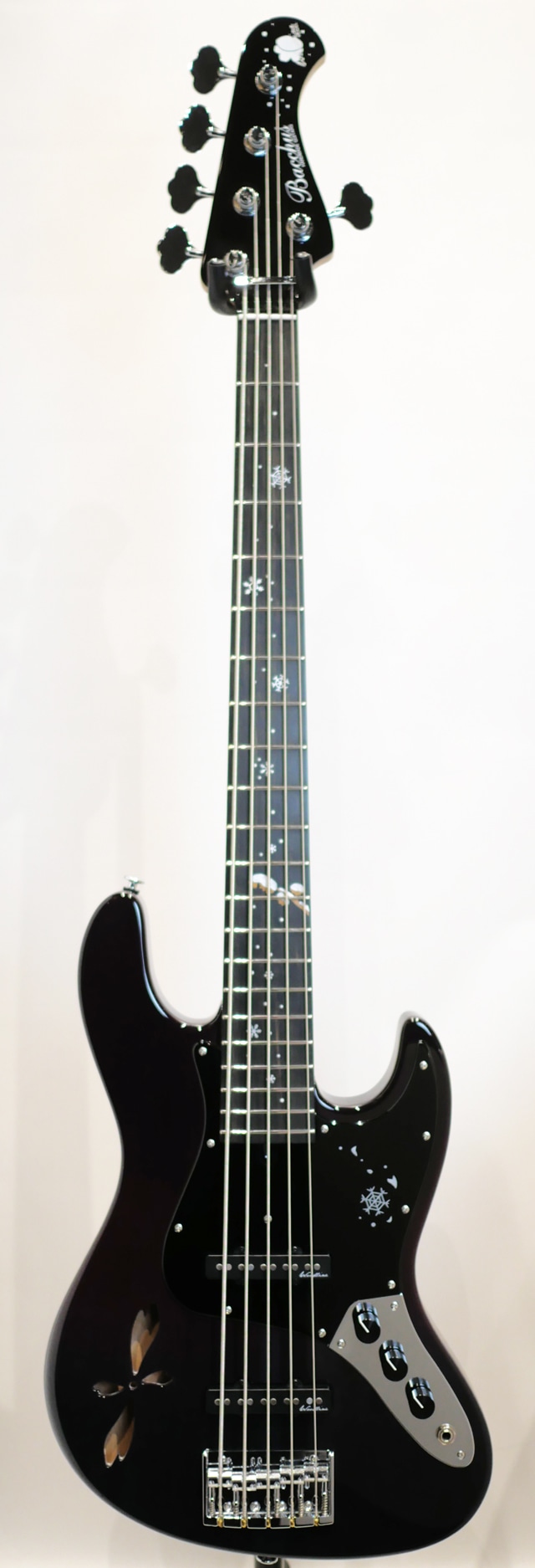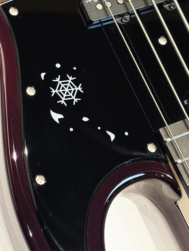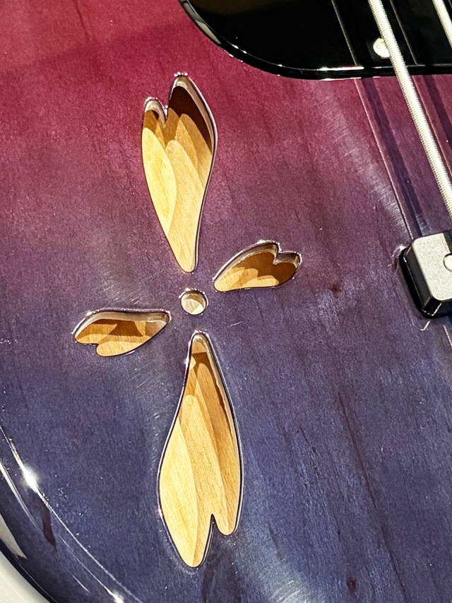 本機では硬質な特性を持つ桜材に、桜の花弁をデザインに落とし込んだサウンドホールを持つボディトップ、ホロウ構造のアルダー材によるラミネートボディ、ネックにメイプル材、雪の積もる桜の枝、雪の結晶などの美麗なインレイワークが目を惹く指板にはエボニー材を使用しております。