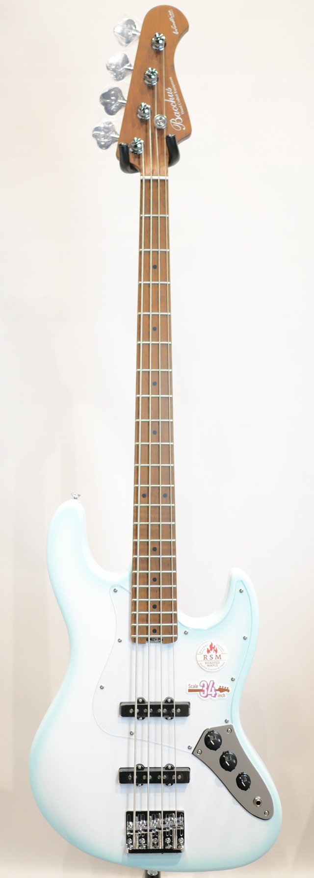 Bacchus Global Series Handmadeシリーズの仕様を海外工場にて生産する事でハイコストパフォーマンスを実現しているBacchusの定番ライン。そのお求めやすい価格帯と確かなクオリティで人気の高いシリーズです。 本国、飛鳥ファクトリーにて製作される最上位機種”WOODLINE”を基に海外生産されている”WL4-STD”モデル。 当機最大の特徴は一目見て分かる色濃いネック材。そのネック&指板には、高温で加熱処理して材の中の水分や油分を一定数量に揮発させることにより剛性を高め、豊かな生鳴りと経年変化したビンテージのような小慣れたトーンを生み出す、高級機種で採用される事の多いローステッドメイプル材が使用されております。ボディは一般的なJBモデルよりも少しスマートなサイズとなるディンキーシェイプが採用されており取り回しの良いサイズが実現しております。 また、上位機種”WOODLINE”シリーズ定番”ターボスイッチ”も搭載され、トーンノブをプルアップすると2つのシングルピックアップをシリーズ(直列)接続し、従来とは一味違う太く力強いハムバッキング・ピックアップのようなサウンドを作り出します。 小振りなベースながらもネック材の特徴もあり力強い低音を持ち幅広いシチュエーションに対応可能なポテンシャルを持っておりますので、これからベースを始めようと思っていた方や、取り回しが良くて使いやすい2本目をお探しだった方におススメのベースです。 ※掲載画像はサンプルです。 Body : Nyatoh Neck : Roasted Maple Fingerboard : Roasted Maple Nut : Graphtech TUSQ XL Bridge : JB bridge w/ brass saddle Machineheads : Open Gear Type Pickup : Original JB set Control : 2Vol,1Tone(Pull up=Turbo SW) Scale : 864mm(34inch) Fingerboard Radius : 310R Width at Nut : 38.0mm Case:オリジナルソフトケース