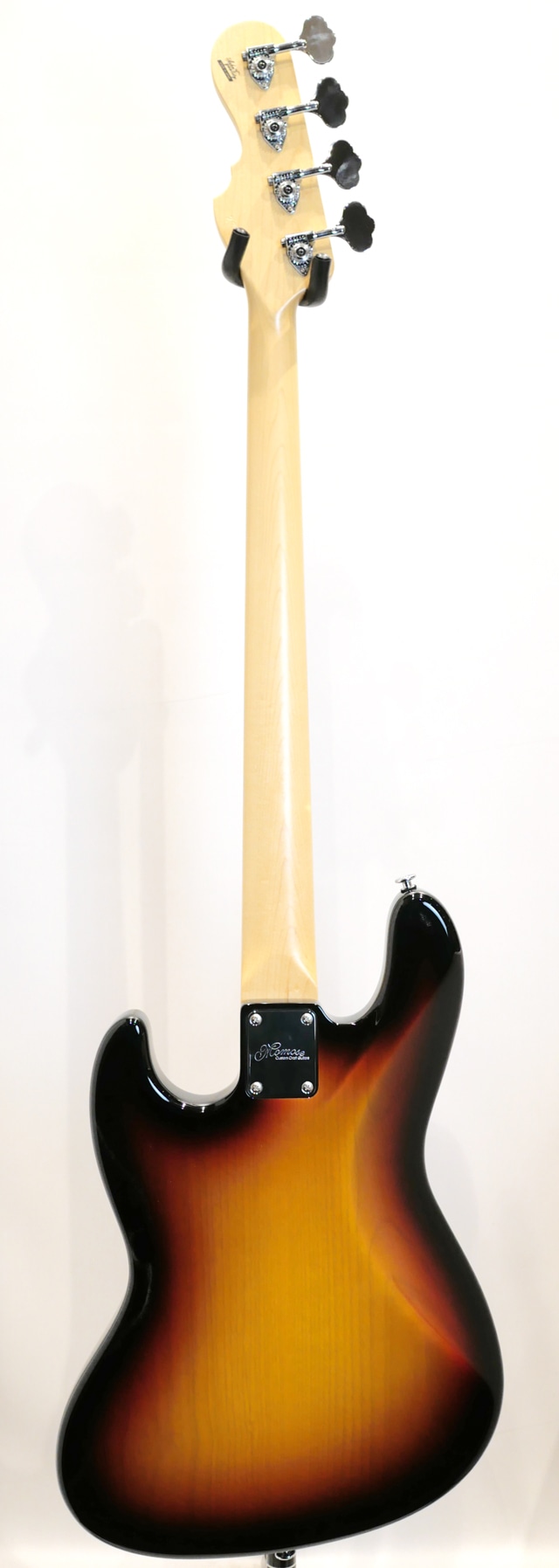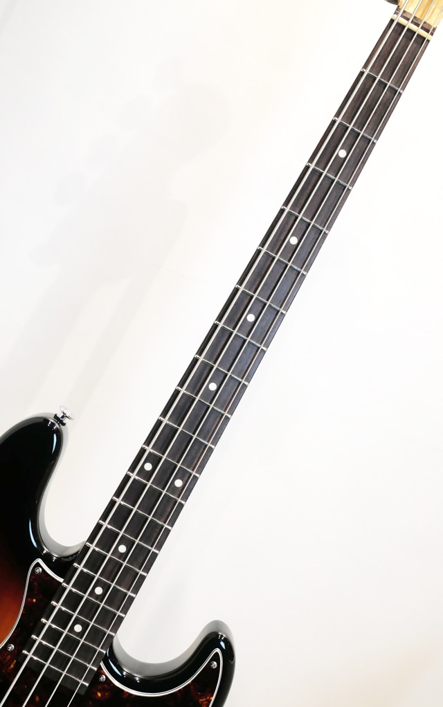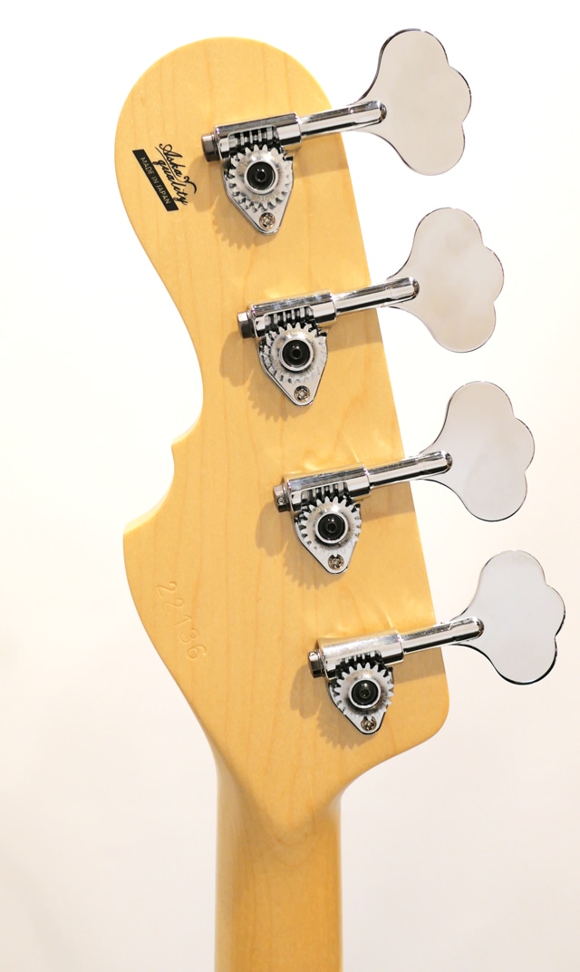 基本仕様として、ボディは一般的なJBタイプと比べ、高音弦側のホーン部の抉りが大きく取られていることによりハイポジションの演奏性が高まるほか、手が大きなプレイヤーの方でもストレス無くハイフレットに向かって駆け上がるプレイが可能なボディデザインを持ち、オーソドックスなプレートジョイントを採用しながらもプレート部分に落とし込み加工を施すことで演奏性をさらに高めております。指板サイドには指板と同材を使用したウッドバインディングを採用し滑らかな指板サイドを実現するほか、季節変化や長年の使用でフレットのバリが出てしまう様なトラブルも防止する様、演奏面でビハインドに成り得る箇所に細やかな処置が施されております。