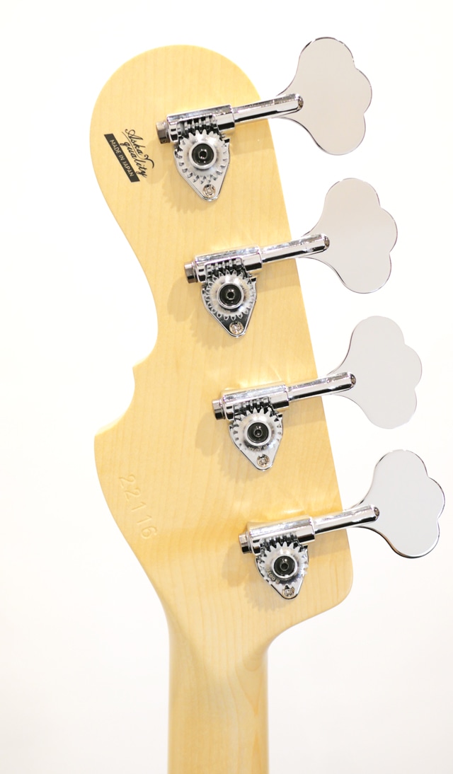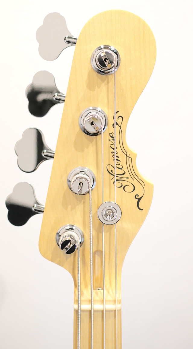 基本仕様として、ボディは一般的なJBタイプと比べ、高音弦側のホーン部の抉りが大きく取られていることによりハイポジションの演奏性が高まるほか、手が大きなプレイヤーの方でもストレス無くハイフレットに向かって駆け上がるプレイが可能なボディデザインを持ち、オーソドックスなプレートジョイントを採用しながらもプレート部分に落とし込み加工を施すことで演奏性をさらに高めております。指板サイドには指板と同材を使用したウッドバインディングを採用し滑らかな指板サイドを実現するほか、季節変化や長年の使用でフレットのバリが出てしまう様なトラブルも防止する様、演奏面でビハインドに成り得る箇所に細やかな処置が施されております。