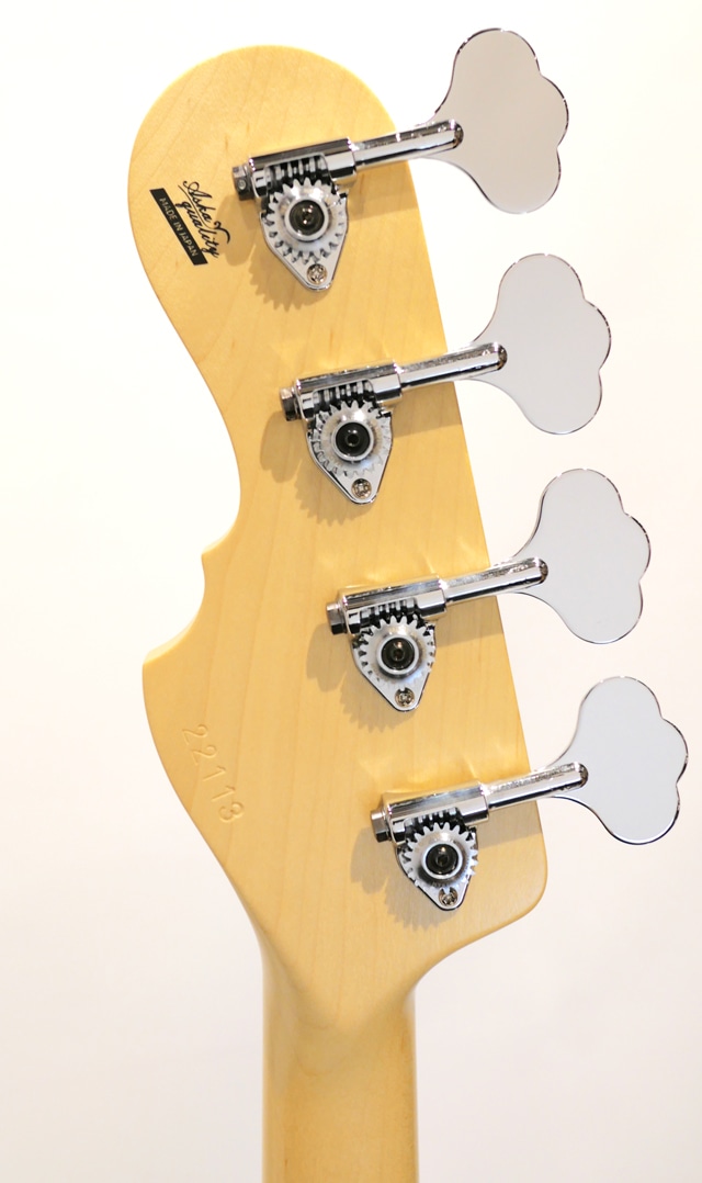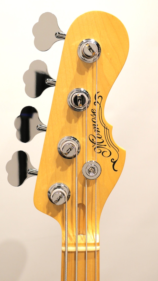 基本仕様として、ボディは一般的なJBタイプと比べ、高音弦側のホーン部の抉りが大きく取られていることによりハイポジションの演奏性が高まるほか、手が大きなプレイヤーの方でもストレス無くハイフレットに向かって駆け上がるプレイが可能なボディデザインを持ち、オーソドックスなプレートジョイントを採用しながらもプレート部分に落とし込み加工を施すことで演奏性をさらに高めております。指板サイドには指板と同材を使用したウッドバインディングを採用し滑らかな指板サイドを実現するほか、季節変化や長年の使用でフレットのバリが出てしまう様なトラブルも防止する様、演奏面でビハインドに成り得る箇所に細やかな処置が施されております。