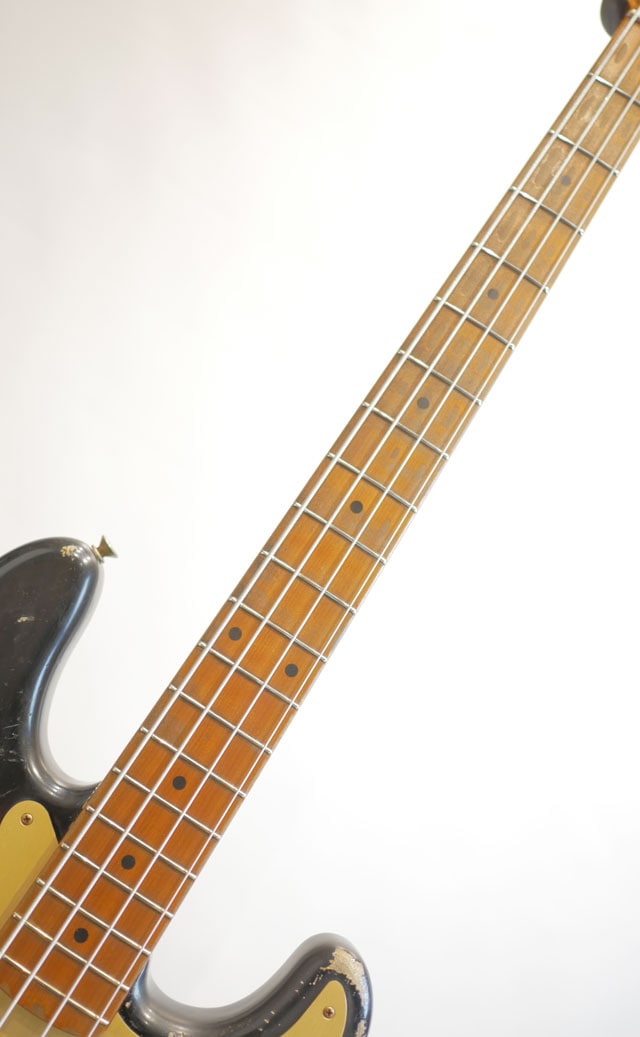 この度入荷したモデルは1957スペックにて構成されたモデル。3弦ポールピースが突出したスタッドポールピースが特徴的な年代になります。ピックアップはホセフィーナ女史によるHW 57 P-BASSピックアップを搭載しております。アルダーボディ、ローステッドメイプルの1pcネック、ネックグリップは厚みのあるソフトVシェイプにてオーダー致しました。太いローステッドメイプルネックの恩恵により、図太くもしっかり抜けてくれる骨太なプレべサウンドをアウトプット致します。ハードピッキングへのレスポンスもスムーズで、サウンドが潰れる事なく荒々しくもしっかり再生致します。またこの時代のトーンはしっかり高域をカット致しますので、トーンを絞り切った際のウォームなサウンドキャラクターはフラットワウンドと組み合わせる事で、深みのあるウッディなトーンへと仕上がります。