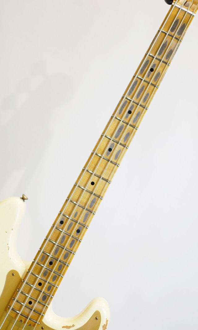 アルダーボディ、メイプルネック/メイプル指板。H/W 57P-BASSピックアップを搭載。3弦ポールピースのみ飛び出たスタックポールピースタイプのピックアップを搭載。雰囲気の良いレリックが施されてたビンテージライクなルックスが目を惹く個体。サウンドも図太い骨太なプレべサウンドをアウトプット致します。メイプルの特性であるアタックの強さと骨太なプレべサウンドの相性も良く、ハードピッキングでもサウンドは潰れる事なくしっかり反応してくれます。ソフトタッチにもしっかり反応致しますので、ダイナミクスの良さもこの個体の魅力の一つかと思います。フレットはここ最近定番の細くて背の高いNARROW TALLをセレクト、ビンテージライクなフィーリングを持ちつつプレイアビリティを高めたモデルになります。
