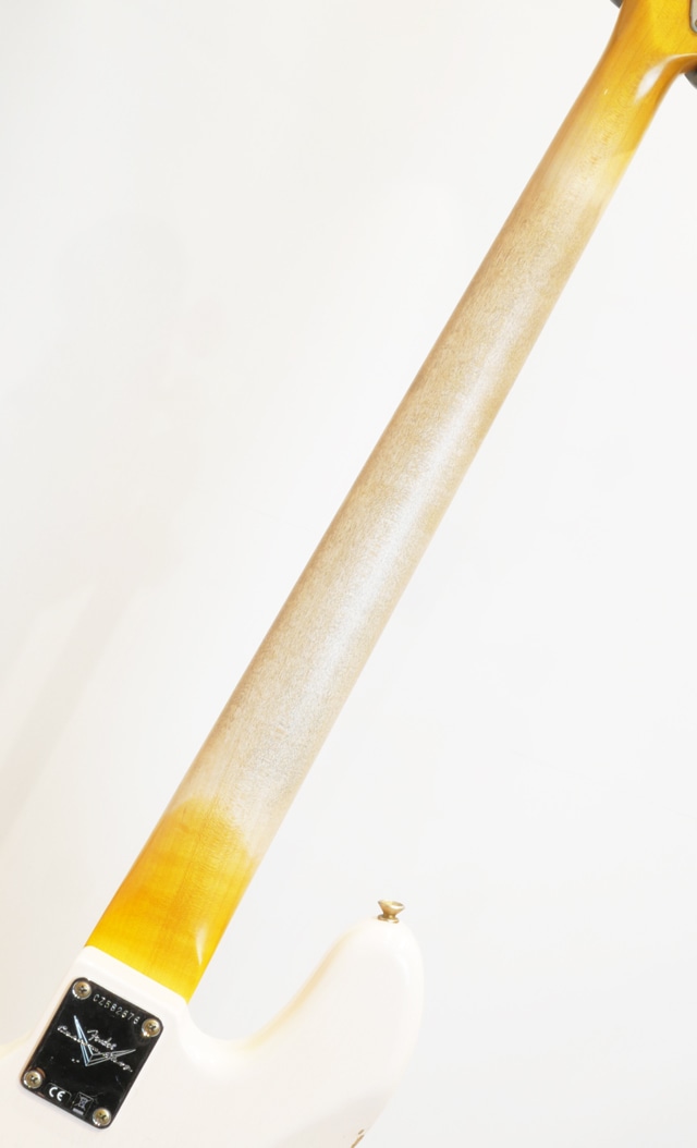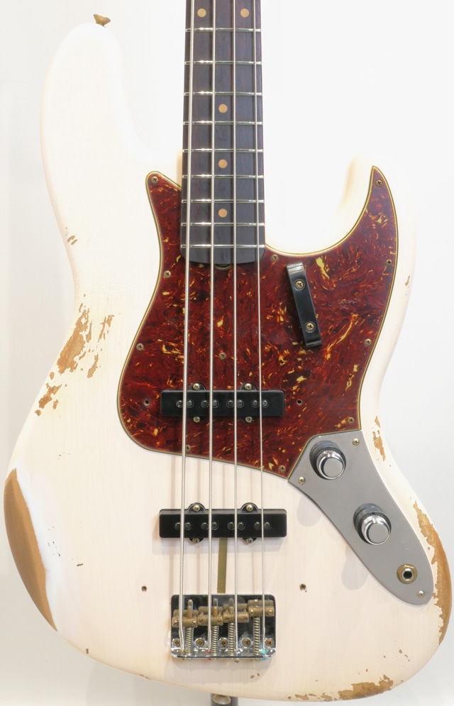 ジャズベースの登場から間もない1961年スペックにて構成されたモデル。アルダーボディ、クォーターソーンに木取りされたメイプルネック/スラブ貼りのローズ指板。ピックアップはHW VINT J-BASSをセットで搭載。7.25指板ラディアス、フレットはミディアムビンテージと呼ばれるビンテージタイプより一回り大きいサイズのフレットをセレクト。コントロールはスタックノブになります。雰囲気の良いレリックが施された個体、シェルピンクは色味が薄くても濃くても雰囲気を損なう事が多く取り扱いが難しいフィニッシュになりますが、フェンダー最高峰ともなりますと抜群の色味にて完成させてくれました。