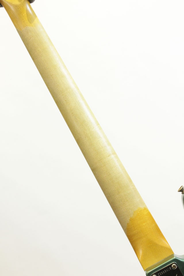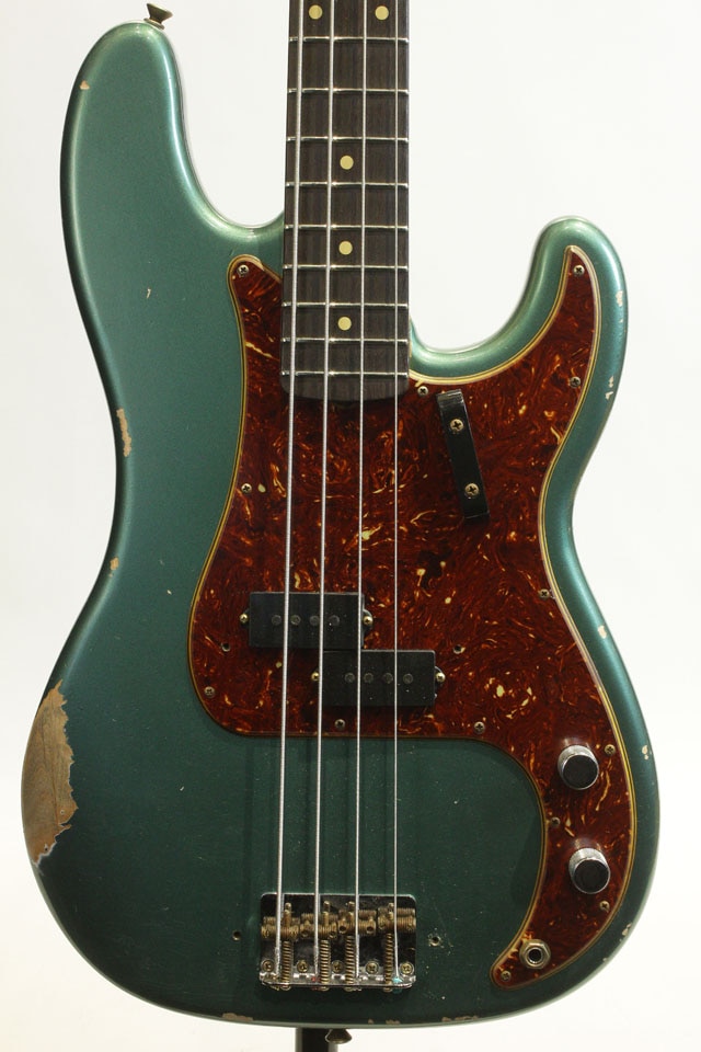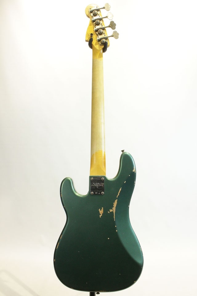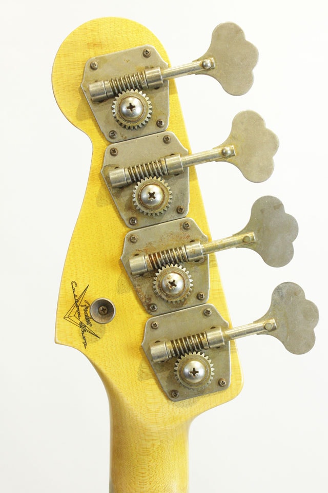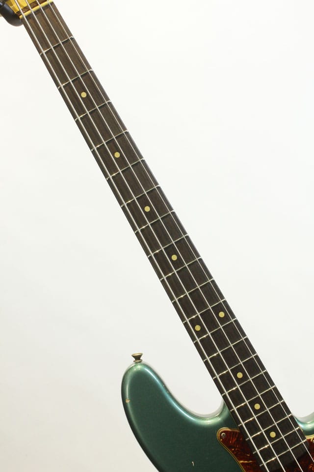 アルダーボディ、メイプルネック/ローズ指板(スラブ貼り)。ハウンドワウンドにて制作された62P-BASSピックアップを搭載。フェンス類を含む総重量は約4.1kgと標準的ウェイトをキープ。クォーターソーンに木取された剛性の高いネックの恩恵によりスムーズなレスポンスが印象的です。ハードピッキングでもサウンドは潰れず荒々しいプレべサウンドをアウトプット致します。全体的にタイトに引き締まった感はありますが、かえって発音も良く、ローポジションの音程感も安定しております。