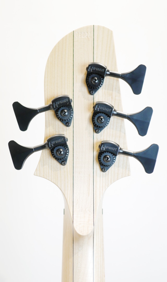 アッシュソリッドボディ、ボルトオン構造のアッシュでメイプルをパウンドした5pcネック/バーズアイメイプル指板。 34インチスケール/24フレット設計。Lorita split coilsピックアップ&Glockenklang 3Bandプリアンプを搭載。ソリッドボディですが総重量は約3.7kgと非常の軽量な個体です。エキゾチックウッドをボディトップにセレクトしたモデルが多い中、敢えて塗り潰しのフィニッシュにてオーダーしましたが、エキゾチックウッドを使用した個体にも負けず劣らず、非常に高級感のある上品なルックスを演出致します。
