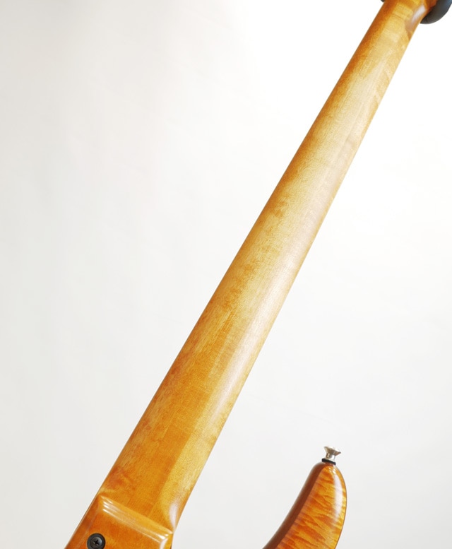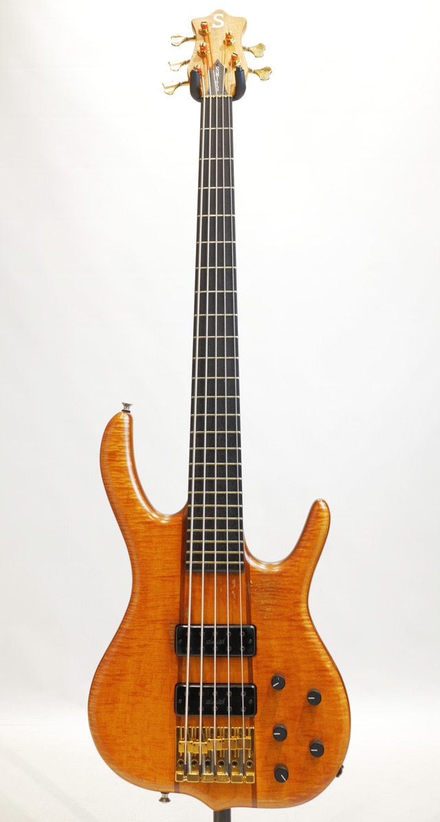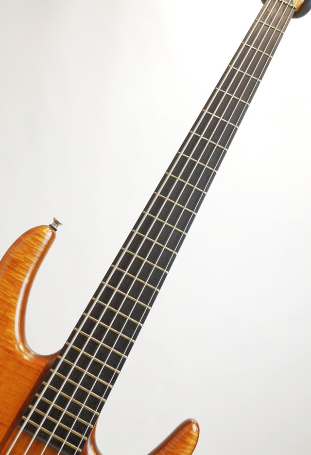 全体にしっかり弾き込まれたコンディションが見受けられる個体。バックルキズに演奏に伴う塗装剥がれも見受けられます。5弦ペグから木部のクラックが伸びておりますが、大分前に修正が施されております。演奏上の問題やチューニングの安定性に問題はありません。ネック剛性に定評のあるケンスミス、こちらの個体も漏れる事無く良好な状態をキープしております。フレットは然程減っておりませんので早急な交換の必要はありません。トラスロッド残量もありプレイコンディションは良好です。手元のEQのセンタークリックがやや弱い手応えです。フィギアードメイプルトップ&バック、ウォルナットコアの3ply構造のウィングボディ。ボディセンターはメイプルをセレクト。ボルトオン構造のメイプル3pcネック/エボニー指板。オリジナルピックアップ&プリアンプを搭載。