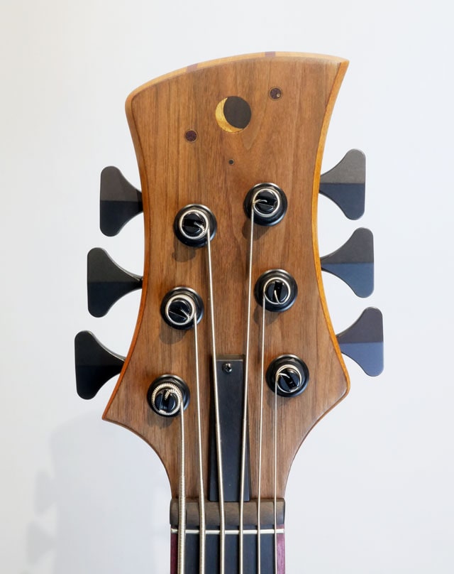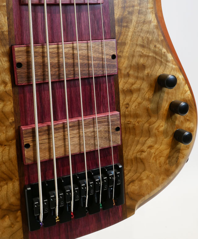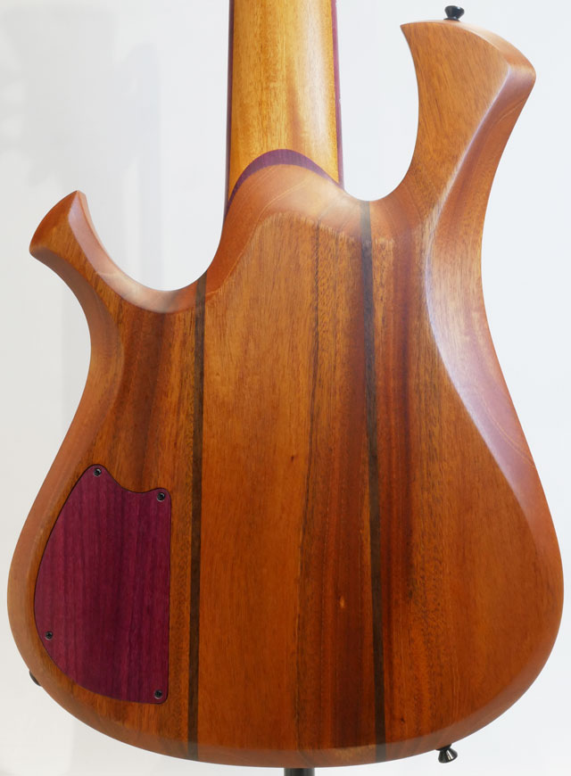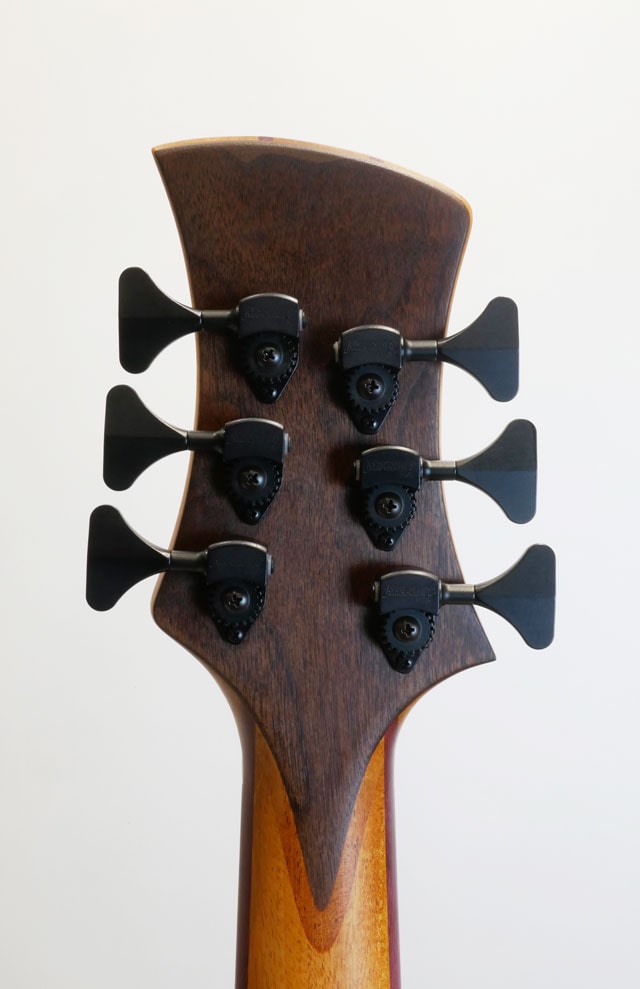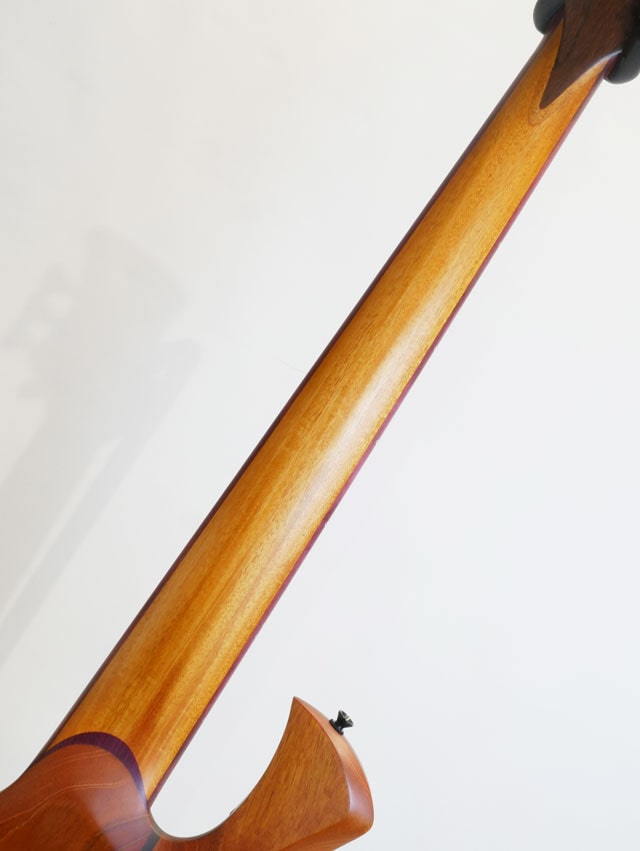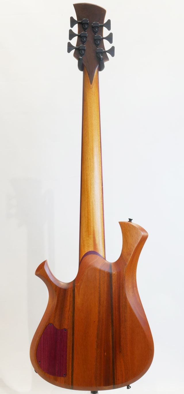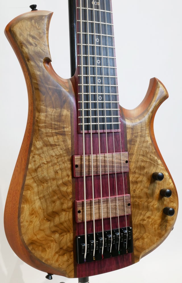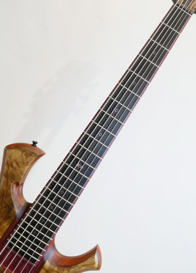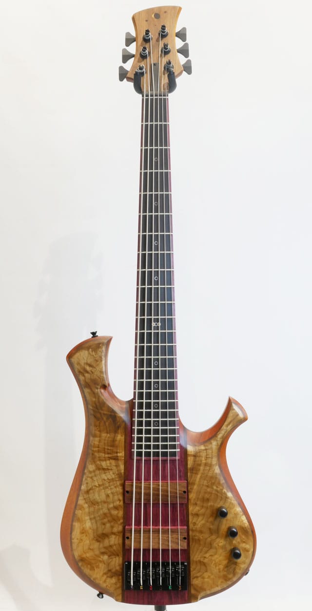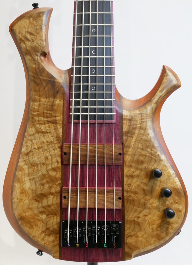 MBJ GUITARSの6弦は生産台数が極めて少ないが、Carl Thompson氏の工房で積んだ豊かな経験と知識を基に製作されている為、パッシブながらも十分なサウンドバランスとポテンシャルを持ち合わた6弦モデルに仕上がっております。サウンドはボディバックのマホガニーのトーンキャラクターが強く、ウッディなローミッドを軸に骨太なサウンドが鳴り響いております。硬質なパープルハートとウォルナットの恩恵によりボトムレンジも適度に引き締まっており、太く発音の良いサウンドです。再生音域の広い6弦モデルですが、どのポジションも安定した音程感と発音の良さを兼ね備えており、Low-Bのローポジションの発音も漏れる事無く、大変クリアに発音致します。師であるCarl Thompson氏にインスパイアを受けている事は必然ですが、師の作品と同等と言っても過言では無い高いポテンシャルを秘めたそんな一本に仕上がっております。良い楽器は一音で分かると言いますが、この個体にはそれが該当すると思います。