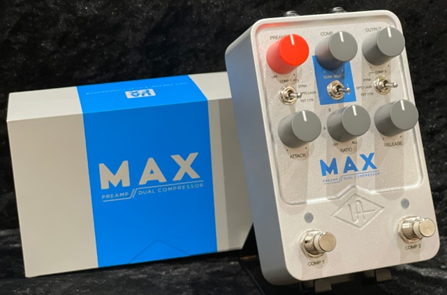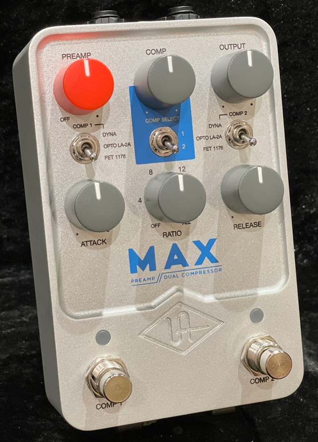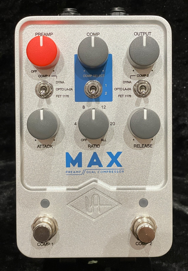 “Max Preamp & Dual Compressor”は、受賞歴のあるUAFX デュアル・エンジン・プロセッシングと究極のサウンドを求める熱い想いを基に、”Teletronix LA-2A”、”UA 1176”、”Dyna Comp*”の伝説的な3種リミッターと、象徴的なチューブマイクプリアンプ “610” の質感と個性を1台のペダルに凝縮し、さらにUAFX Controlアプリで、プリアンプのEQ設定、シリアル/パラレル設定、サイドチェーンベースフィルターの設定などをカスタマイズ可能した”Universal Audio”が送り出す最上級のプリアンプ&コンプレッサーです。