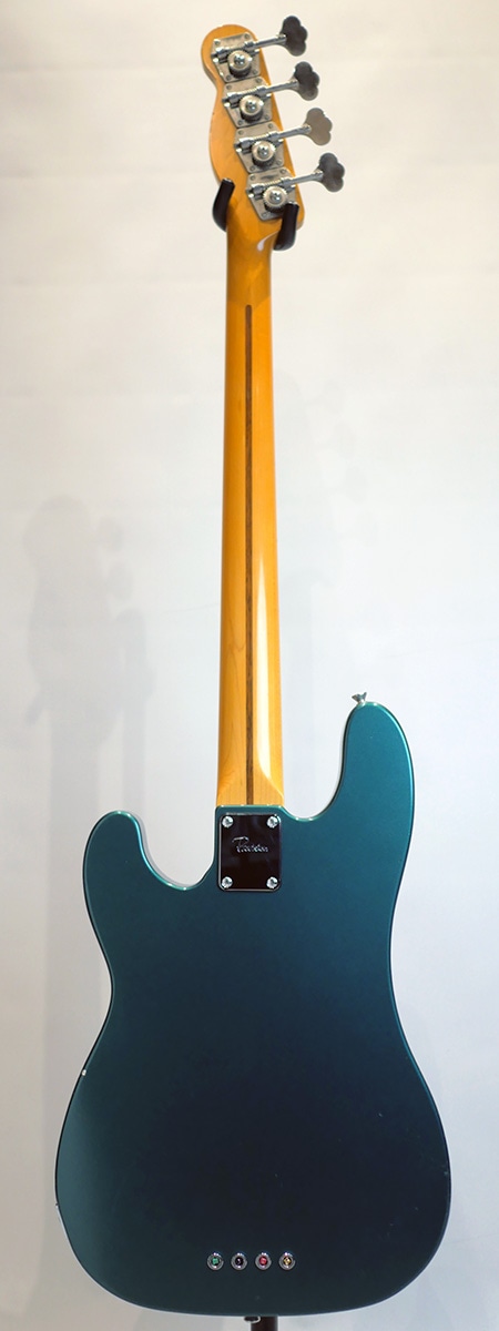 当機はOPBスタイルにて製作されたカスタムオーダーモデル。セミホロウ加工が施されたアッシュボディには1ピースのメイプルがボルトオンにてジョイントされています。特筆すべきはその軽量さで、約3.15kgとベースということを考えると驚異的な軽さを実現。流石にこの重量ですとネックに重心が偏るため、ヘッド落ちはしてしまいますが意外と気になる程ではなく、取り回しが良いため右腕で抑えつけることで簡単にヘッド落ち対策が可能です。