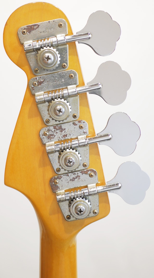 ナット周辺の木部欠け修正痕がございます、また使用感は年代相応と言った所です。ネックコンディションは良好状態をキープ、フレットはビンテージタイプの細いサイズへ交換しておりますが減りも無くプレイコンディションは良好です。交換パーツが多くとも、ビンテージフェンダーらしいサウンドキャラクターは健在。リワインドされたリアピックアップも馴染んでおり、新品楽器では得られないビンテージ物特有のトーンを持ち合わせております。交換パーツやリペア歴もありビンテージ的価値は低いですが、70sフェンダージャズベースのサウンドをお求めであればおススメの個体です。バダスブリッジへ交換した事でサウンドにソリッド感が増し、70年代後期の個体に求めるタイト且つ力強いサウンドをアウトプット致します。