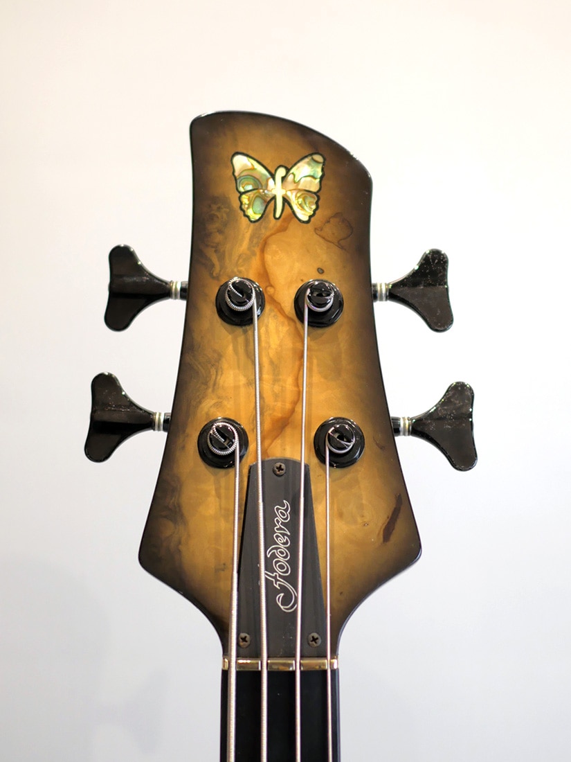 電装系にはHAZプリアンプと現在では使用されていないLane poor製ピックアップを搭載。Lane Poor製ピックアップもこの年代ならではの仕様です。Lane Poorピックアップはレンジが広くハイファイなトーン傾向ではあるのですが、程よい粘りもありバランスに優れたサウンドでFoderaにマッチする優秀なピックアップといった印象です。ローノイズである点も嬉しいポイントです。プリアンプのEQも絶妙な設計で、様々なジャンルにマッチするサウンドメイクが簡単に行える、適応力の高さを持っています。