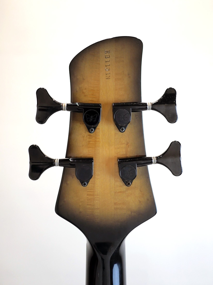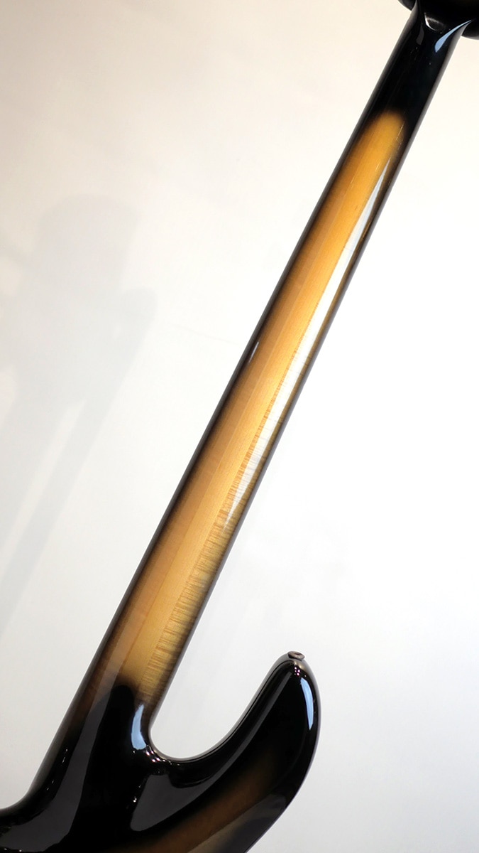 本機は1996年製のEmperor Elite 4st。バックアイバールをトップに貼り付けたアルダーウィングボディ、3ピースのメイプルネックを採用しており、ネックはElite仕様にてボディと接合されています。FoderaならではのスルーネックジョイントであるEliteオプションは、ハイポジションへのアクセス性向上に加えてクイックレスポンスとロングサステインを実現。スルーネックのボディバックにあたる面には、ウィング材と同じアルダーのトーンブロックが使用されており、アルダー材の特性が更に色濃くサウンドへ反映される点に加え、見た目の統一感も演出しています。