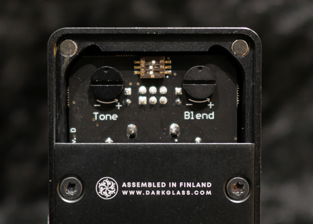 2つのつまみでとてもシンプルですが、背面パネルの1部がマグネット式となっており、ピックなどを使って簡単にパネル部分を取り外しが可能となっており、取り外すとトリムポットで調整できる「TONE」 と「BLEND」に、DIP スイッチで低音をブーストできる「GRUNT」のON / OFF と300Hz~1kHzまでの中低音域をブーストする「MBOOST」のON / OFFが搭載されており、サウンドメイクの幅が広げられる機能も沢山搭載しております。