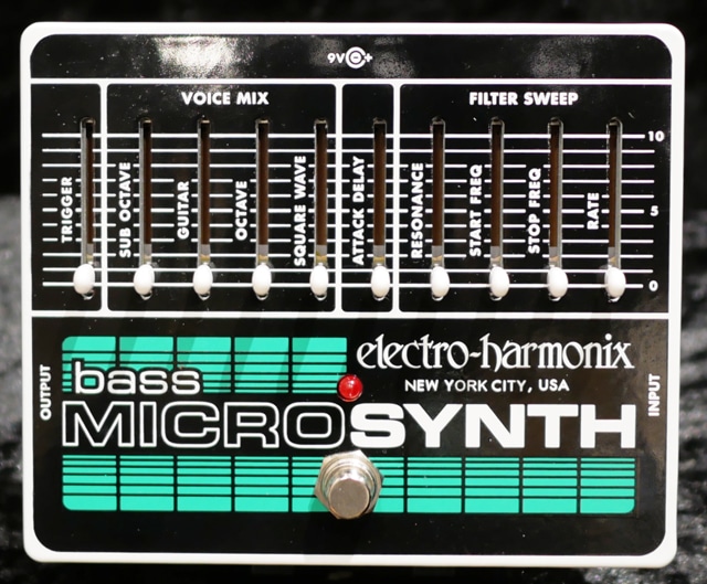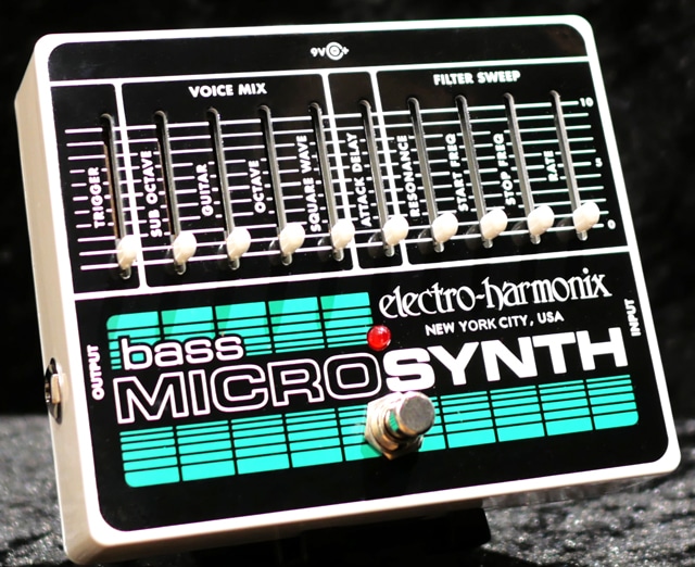 Bass Micro Synthesizerは、ギター用マイクロシンセをベース用にチューニングした製品です。パーカッシブなサウンドから弓弾きの様な逆回転サウンドまで、10個のスライダーを操作することによって初期のムーグ・シンセサイザーに代表されるヴィンテージ・アナログ・シンセサウンドをコントロールすることができます。