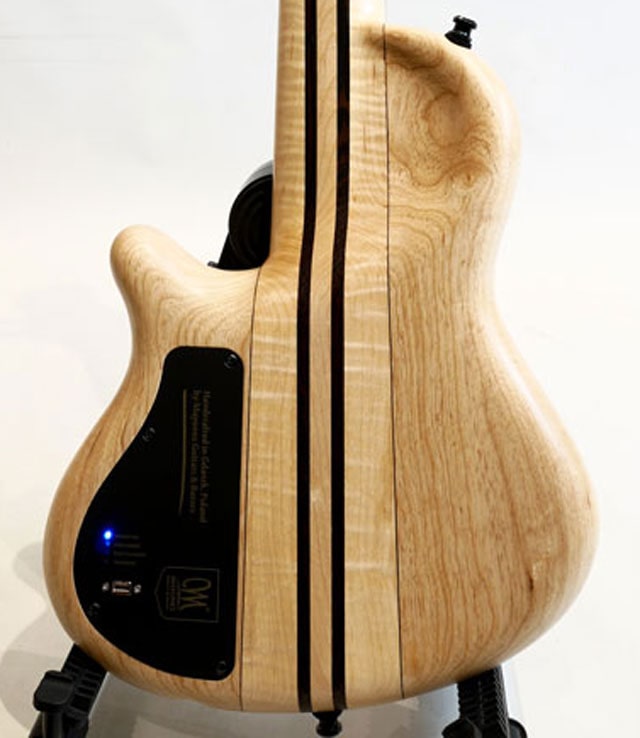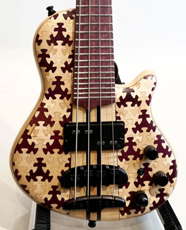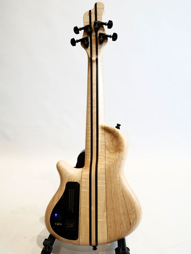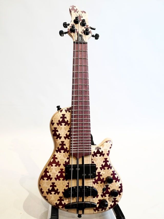 17.1インチスケールの超本格的ミニベースCali4。ピックアップにMayonesオリジナルピックアップを搭載。小振りですがボトムのしっかしたサウンドをアウトプット致します。ミニベースだからと妥協しないメーカーの本気が伝わって来ます。パズルの様なデザインで構成されており、様々なも木材を組み合わせております。ネックはメイプル&ウェンジから構成されており、低音の再生能力+剛性を高めた仕様になります。指板はパープルハートをセレクト。充電式のヘッドフォンアンプを装備しており、トラベルベースとしても高いポテンシャルを持ち合わせております。直接ヘッドフォンをジャックイン出来るのもこのモデルの特徴であり魅力の一つだと思います。