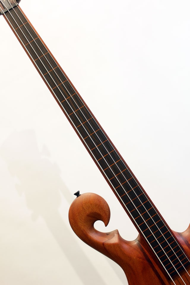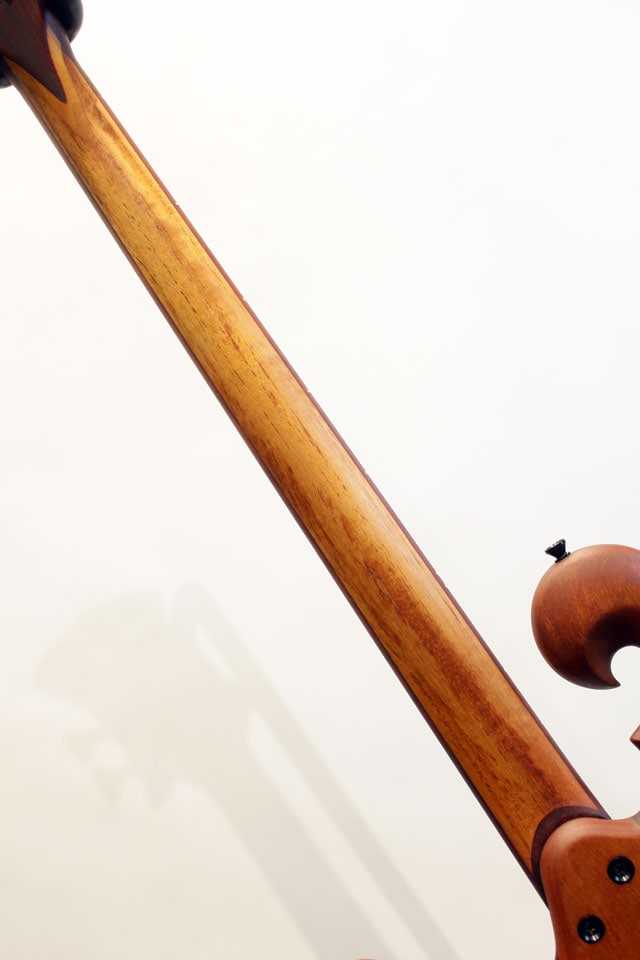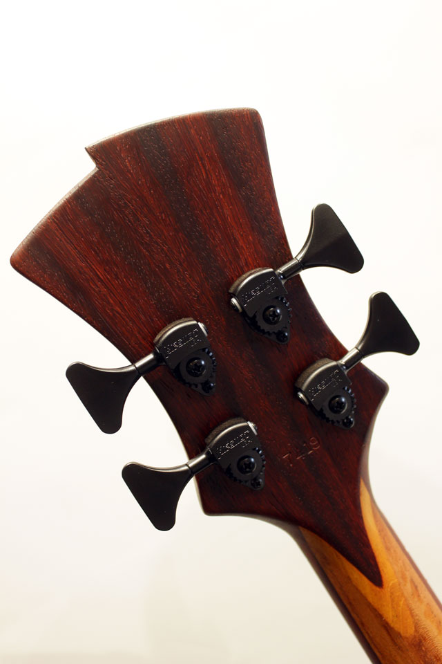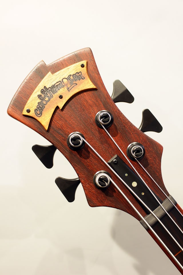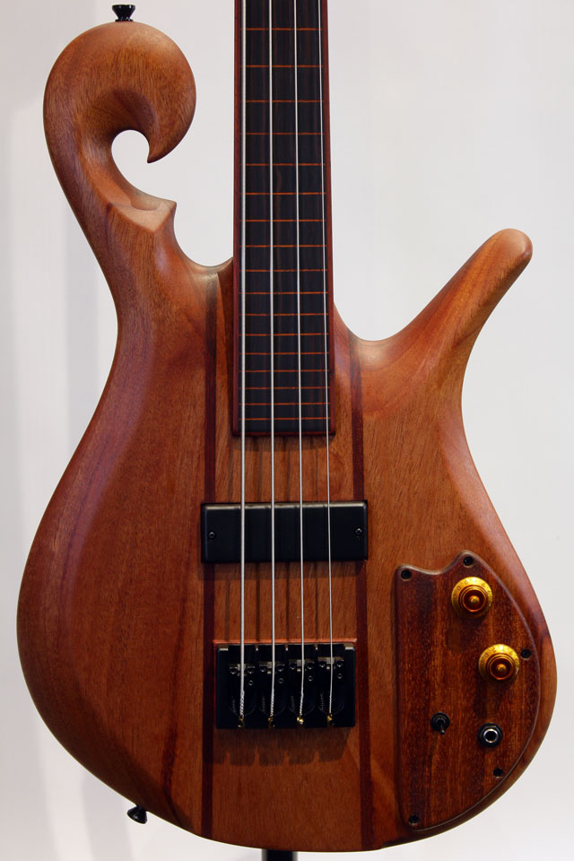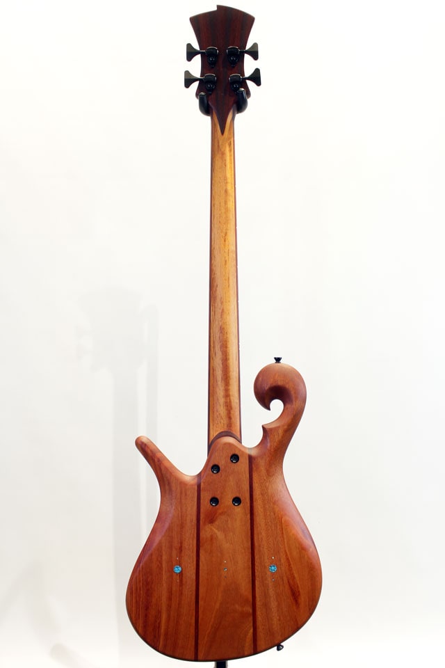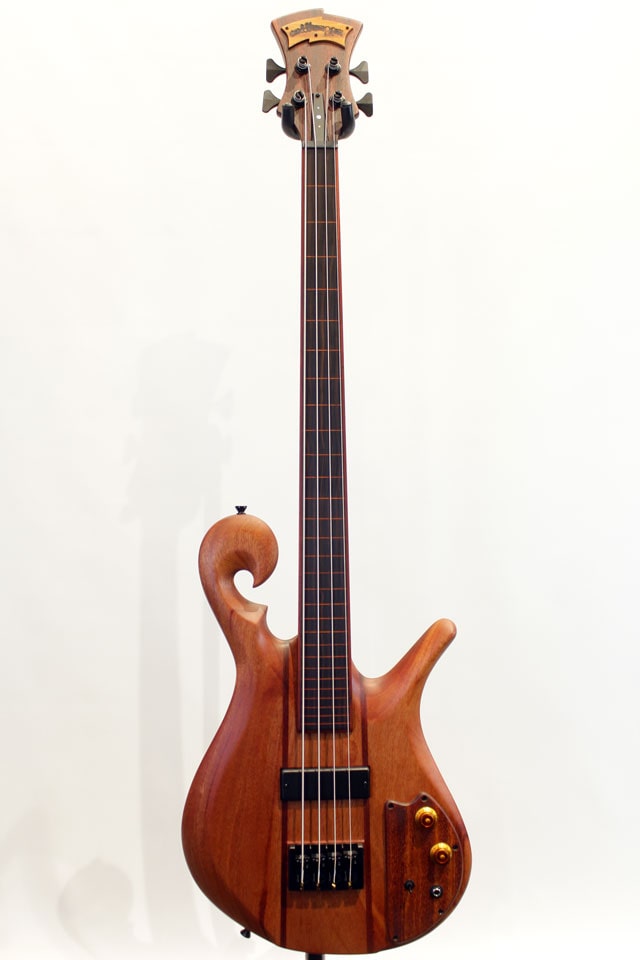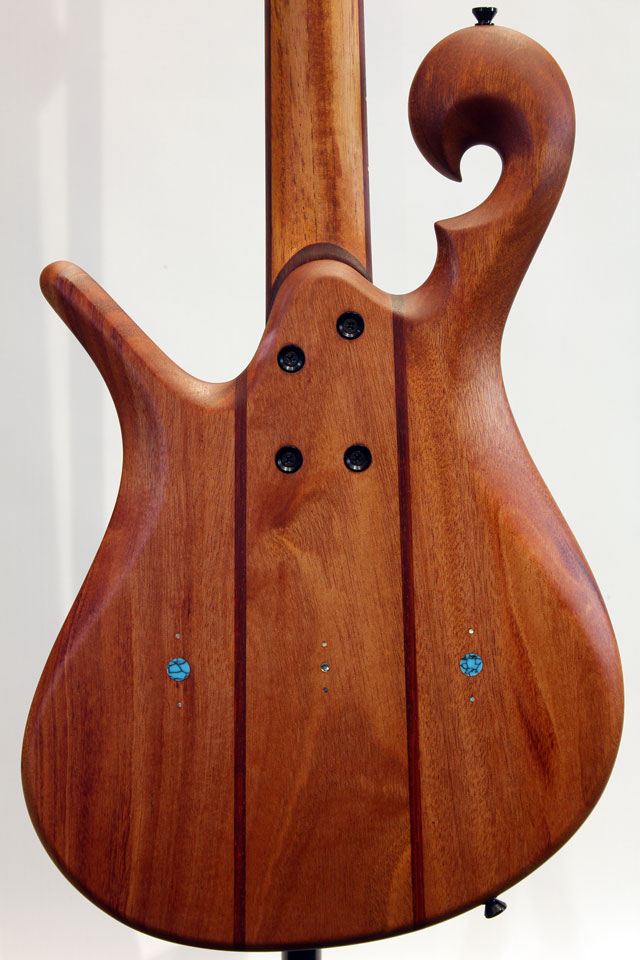 ボディバックにインレイを施した、個性の光るユニークなルックスのモデル。フロント気味にマウントされたピックアップポジションと、32インチ独特のテンション感から得られる、ウッドベースの様な太く深く鳴り響いてくれるフレットレストーンは流石です。