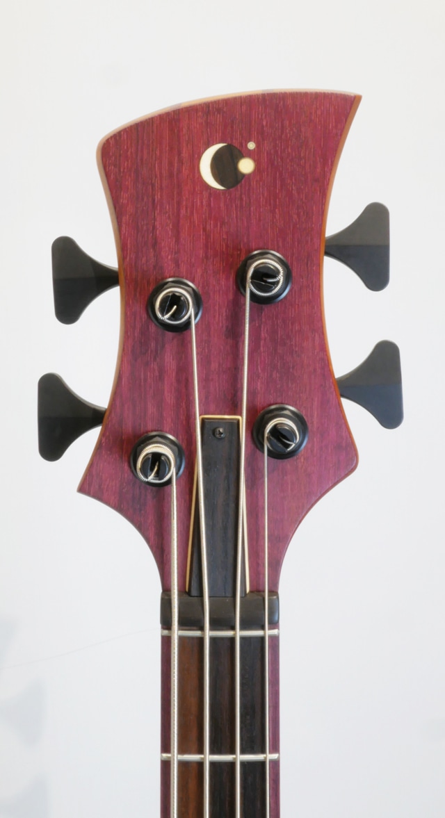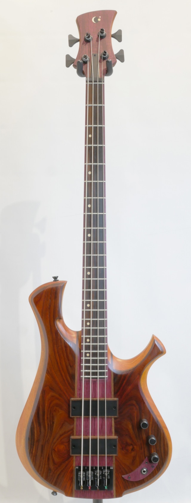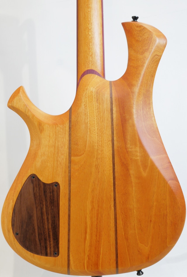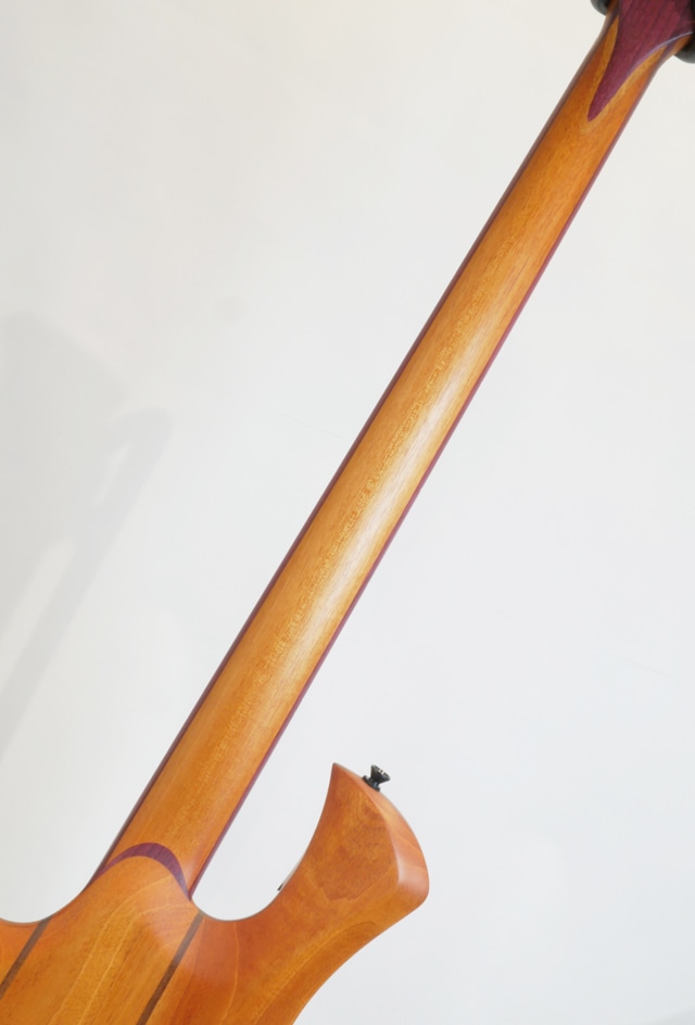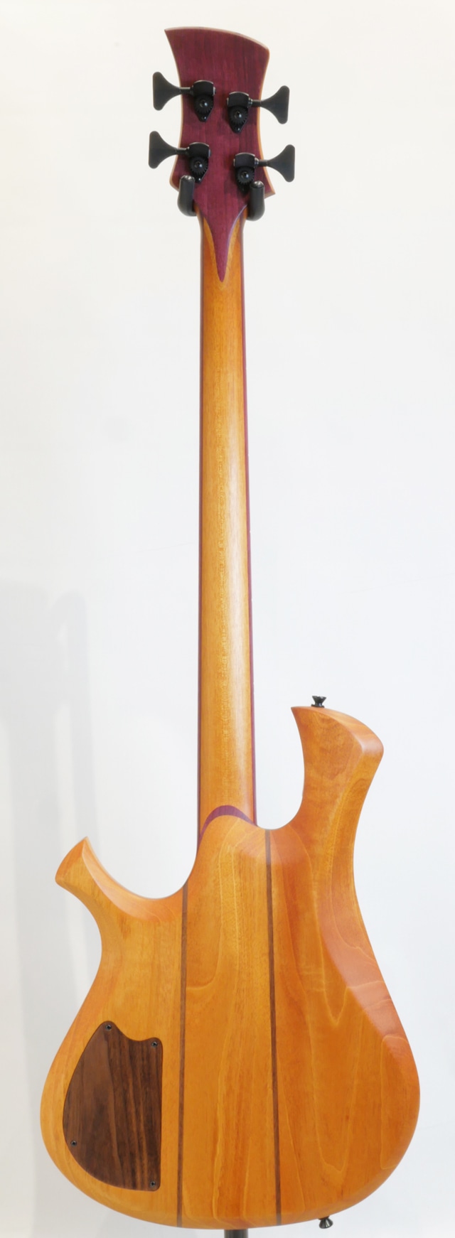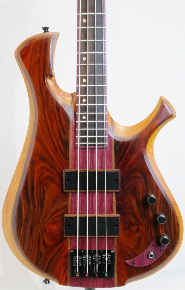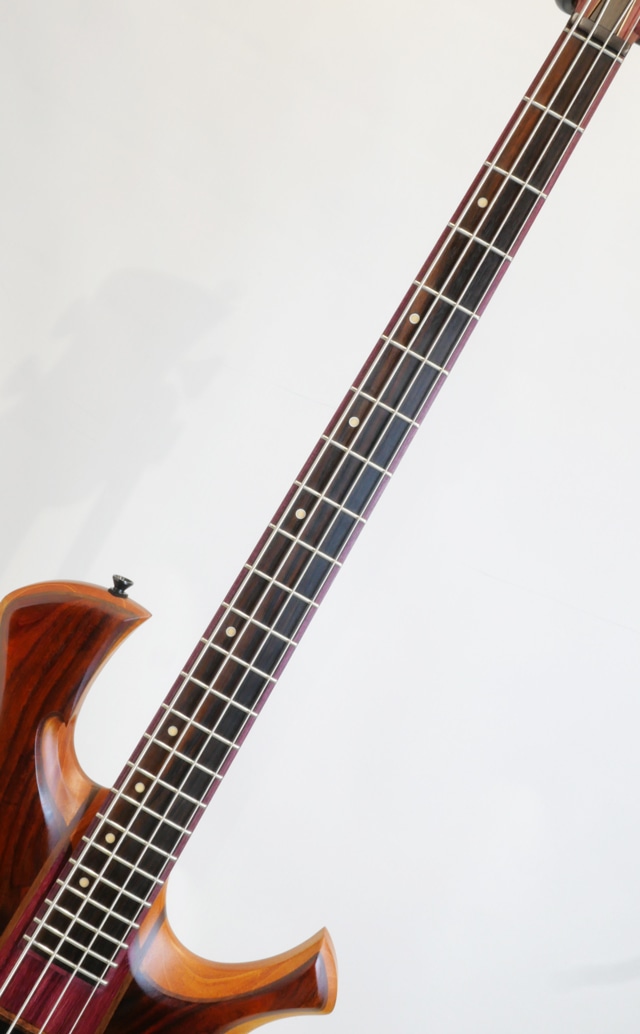 この度入荷したThe Double Bit 4stは、ココボロ、マホガニー、ウォルナットから構成された3plyボディにパープルハートのセンターブロックをセレクト。ディープジョイント構造のセットネックはマホガニーネック/エボニー指板。ウッドバインディングはパープルハートを使用。Kent Armstrong MMピックアップを搭載したパッシブモデルになります。マホガニー特有の豊かなローミッドにより太く力強いトーンをベースにパッシブらしい木材の持つトーンキャラクターを最大限引き出した、クセの無い極上のパッシブトーンをアウトプット致します。硬質な木材も多用する事でサウンドがタイトに引き締まり、発音の良い明瞭感が加味されております。ケントアームストロングピックアップとの相性も良く、木材の個性を活かしたパッシブの楽しみ方が詰まった一本に仕上がております。総重量は約3.2kgと驚異的なウェイトの個体ですが、師匠譲りの抜群のウェイトバランスを持ち合わせているのもMBJ GUITARSの魅力の一つかと思います。