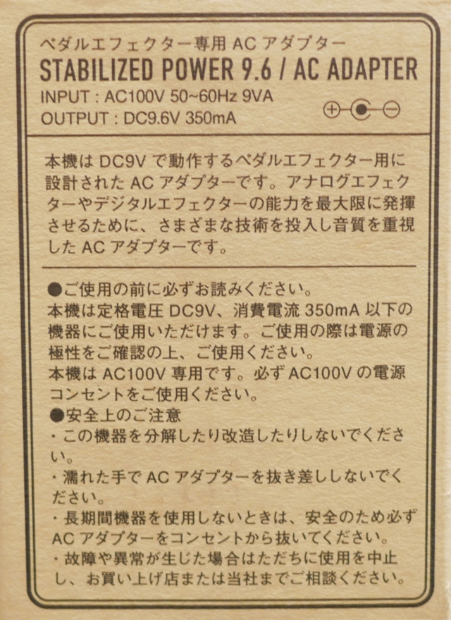 本機は定格電圧DC9V(センターマイナス)、消費電流350mA以下の機器にご使用いただけます。ご使用の際は、電源の極性をご確認の上ご使用ください。