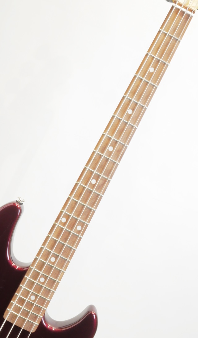 当機は、パイン材ボディ、ハードロックメイプル材ネック、カリビアンローズウッド指板のウッドマテリアル。ボディのパイン材はファクトリーのあるカリフォルニア州を含めた北米西海岸全域で入手が可能な材となり、楽器のボディ材や家具の板材として見かける事も多い事でしょう。メイプル材やアッシュ材に比べると柔らかい音色持った木材となります。硬質なメイプル材ネックとの組み合わせにより中低域の広がりの中に力強く、粘りとコシのあるアタック感と音像も明瞭なトーンを生み出しています。指板材のカリビアンローズウッドは別名チェチェンやホンジュラスウォルナットと呼ばれ、トーンウッドとして楽器で用いられる、定番に表記される各産地のローズウッドの様な方向性の音質の木材です。楽器の中低域に引き締まった鳴と中高域の乾いた響きを与えてくれます。特徴的なサドルロック機構が装備されたオリジナルブリッジ、ネックはナット幅41.2mmのCシェイプネックに9.5Rの指板、フレットは押さえ心地の良いミディアムジャンボサイズ、ネックフィニッシュにはサテンフィニッシュが採用されております。