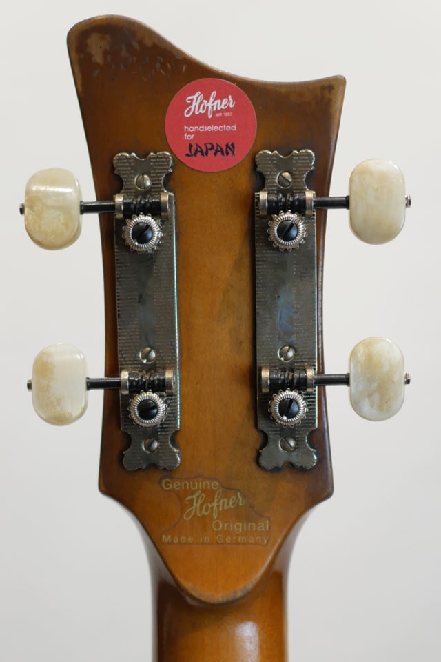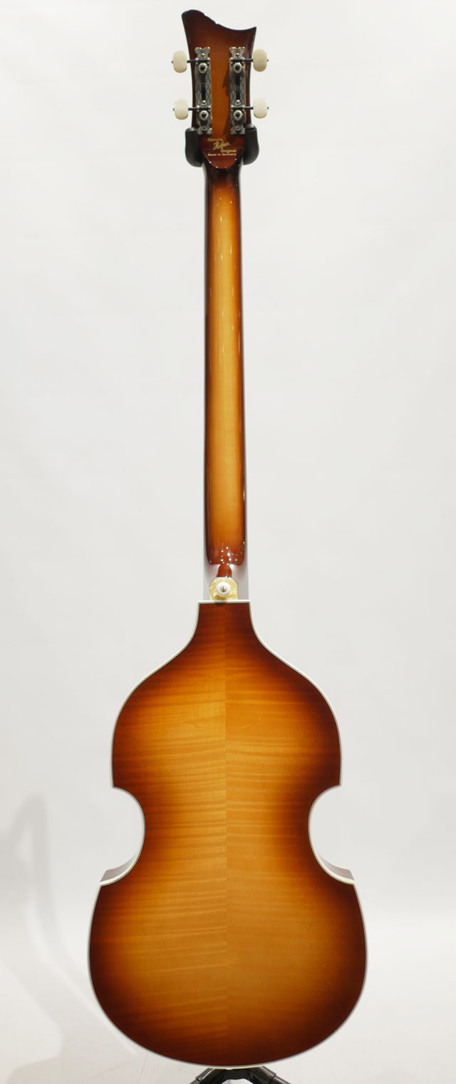 1963年頃のスペックを基としたモデル。スプルーストップ&フレイムメイプルサイド/バックのフルホロウ構造のボディは定番ですが、ネックはセンター2pcにてラミネイトされたフレイムメイプルネック/ローズ指板になります。ピックアップはステイプルトップタイプを搭載、エスカッションはもちろんスモールタイプになります。このモデルの特徴は何といっても塗装ではないでしょうか。レギュラーモデルとは異なった塗装工程が採用されているのは、見た瞬間明確です。Hofnerのヴァイオリン製造部門の塗装職人が担当されており、ヴァイオリンの質感に近しい塗装に仕上がっている印象です。その為出音もレギュラーモデルとも異なり、Vintage Hofnerのニュアンスを持つサウンドをアウトプット致します。Vintage Hofnerも高騰の一途を辿っておりますので、プレイアビリティの高いVintage Hofnerのニュアンスを持つ個体をご検討であれば、大変おススメなモデルです。
