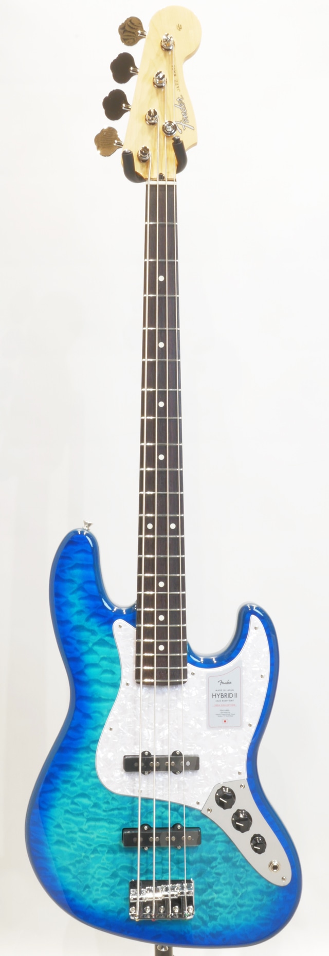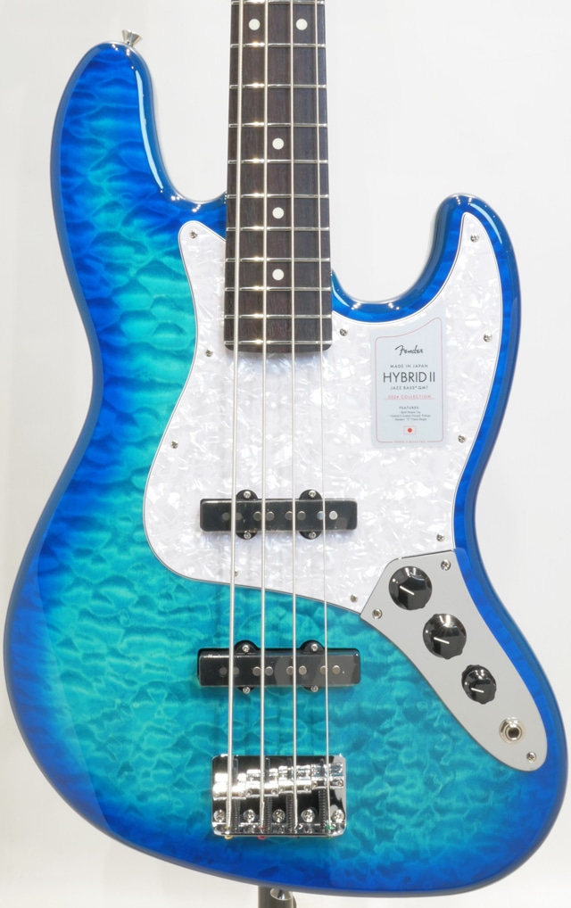 限定スペックによる”2024 Collection”キルトメイプルトップの「Made in Japan Hybrid II Jazz Bass 」です。アルダーにキルトメイプルをTOPに配したラミネートボディ、スリムでスマートなModern”C”シェイプのメイプルネック、9.5インチラジアスのローズウッド指板とナロートールフレットがスムーズなプレイヤビリティを提供、スタッガードポールピース仕様の”Hybrid II Custom Voiced Single Coil”ピックアップを装備し、ヴィンテージスタイルのブリッジの下にはサスティンブロックを搭載しています。 「Made in Japan Hybrid II」は、ヴィンテージなルックスはそのままに、プレイヤーや音楽のジャンルを選ばないオールマイティーなモダンスペックを盛り込んだ、まさに「ハイブリッド」と呼ぶにふさわしいシリーズです。 リズム/リード問わず、どのギタリストやベーシストにもフィットする演奏性と楽器のトーンを兼ね備えた製品を、世界的にファンの多い”Made in Japan”で実現しています。王道のサウンドをより扱い易く多くのプレイヤーにフィットしたパフォーマンスを提供してくれます。 BODY Body Material:Alder with Quilt Maple Top Body Finish:Gloss Polyurethane Body Shape:Jazz Bass ELECTRONICS Bridge Pickup:Hybrid II Custom Voiced Single Coil Jazz Bass Middle Pickup:Hybrid II Custom Voiced Single Coil Jazz Bass Controls:Volume 1. (Middle Pickup), Volume 2. (Bridge Pickup), Master Tone HARDWARE Bridge:4-Saddle Vintage-Style Hardware Finish:Nickel/Chrome Tuning Machines:Vintage-Style Pickguard:3-Ply White Pearloid Control Knobs:Black Plastic Neck Plate:4-Bolt NECK Neck Material:Maple Neck Finish:Satin Urethane Finish on Back, Gloss Urethane Finish on Front Neck Shape:Modern "C" Scale Length:34" (86.36 cm) Fingerboard Material:Rosewood Fingerboard Radius:9.5” (241 mm) Number of Frets:21 Fret Size:Narrow Tall Nut Material:Bone Nut Width:1.5” (38.1 mm) Position Inlays:White Dot