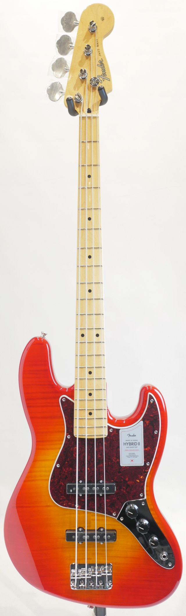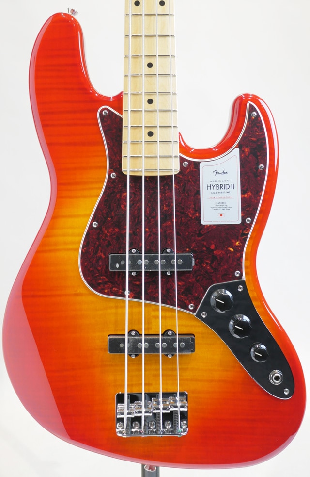 限定スペックによる”2024 Collection”フレイムメイプルトップの「Made in Japan Hybrid II Jazz Bass 」です。アルダーにフレイムメイプルをTOPに配したラミネートボディ、スリムでスマートなModern”C”シェイプのメイプルネック、9.5インチラジアスのローズウッド指板とナロートールフレットがスムーズなプレイヤビリティを提供、スタッガードポールピース仕様の”Hybrid II Custom Voiced Single Coil”ピックアップを装備し、ヴィンテージスタイルのブリッジの下にはサスティンブロックを搭載しています。