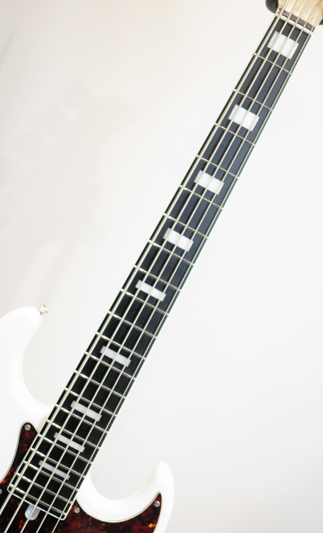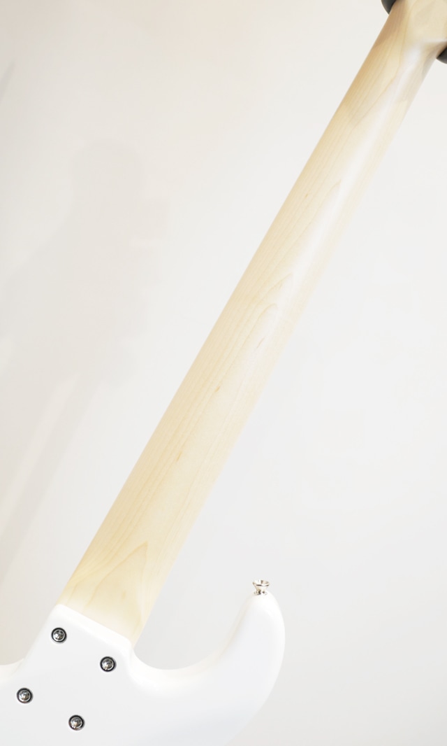 アルダーボディ、ボルトオン構造のメイプルネック/エボニー指板の21フレット仕様。オリジナルピックアップMJB575&バルトリーニ"XTCT"を搭載。コントロールにリンクしているスイッチは須藤氏拘りのボリュームバイパス・スイッチになります。スイッチのオン/オフでフルテンサウンドとボリュームを絞ったサウンドが瞬時に切替わり、指弾きとスラップなどの音作りに欠かせないコントロールとして装備されておりますので、弾き手のアイデアで幅広くご活用下さいませ。GOTOH製ペグ&ブリッジを装備しパーツカラーはクロームカラーに統一、そして須藤モデルのトレードマークである木製フィンガーレストをマウント。
